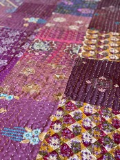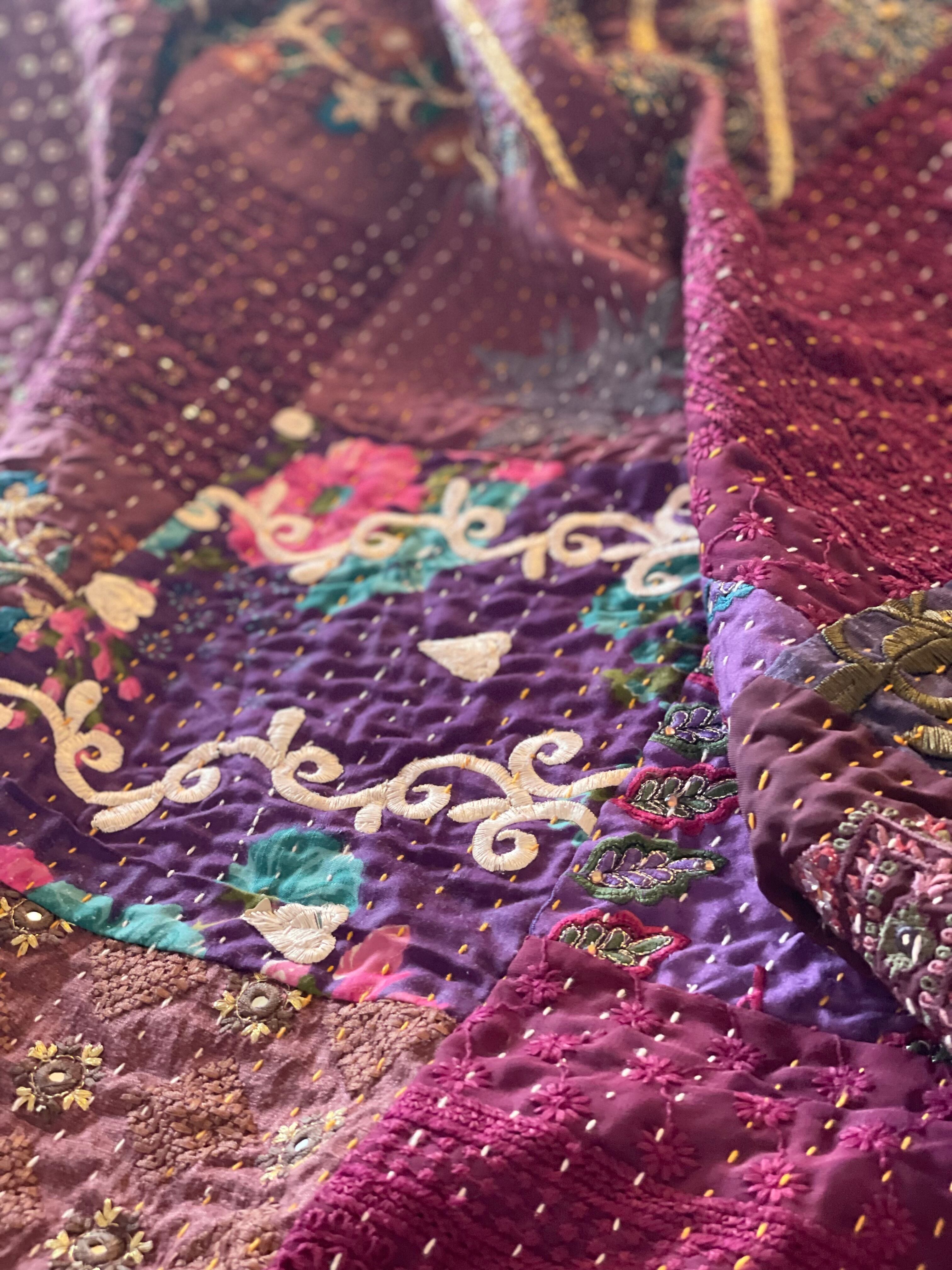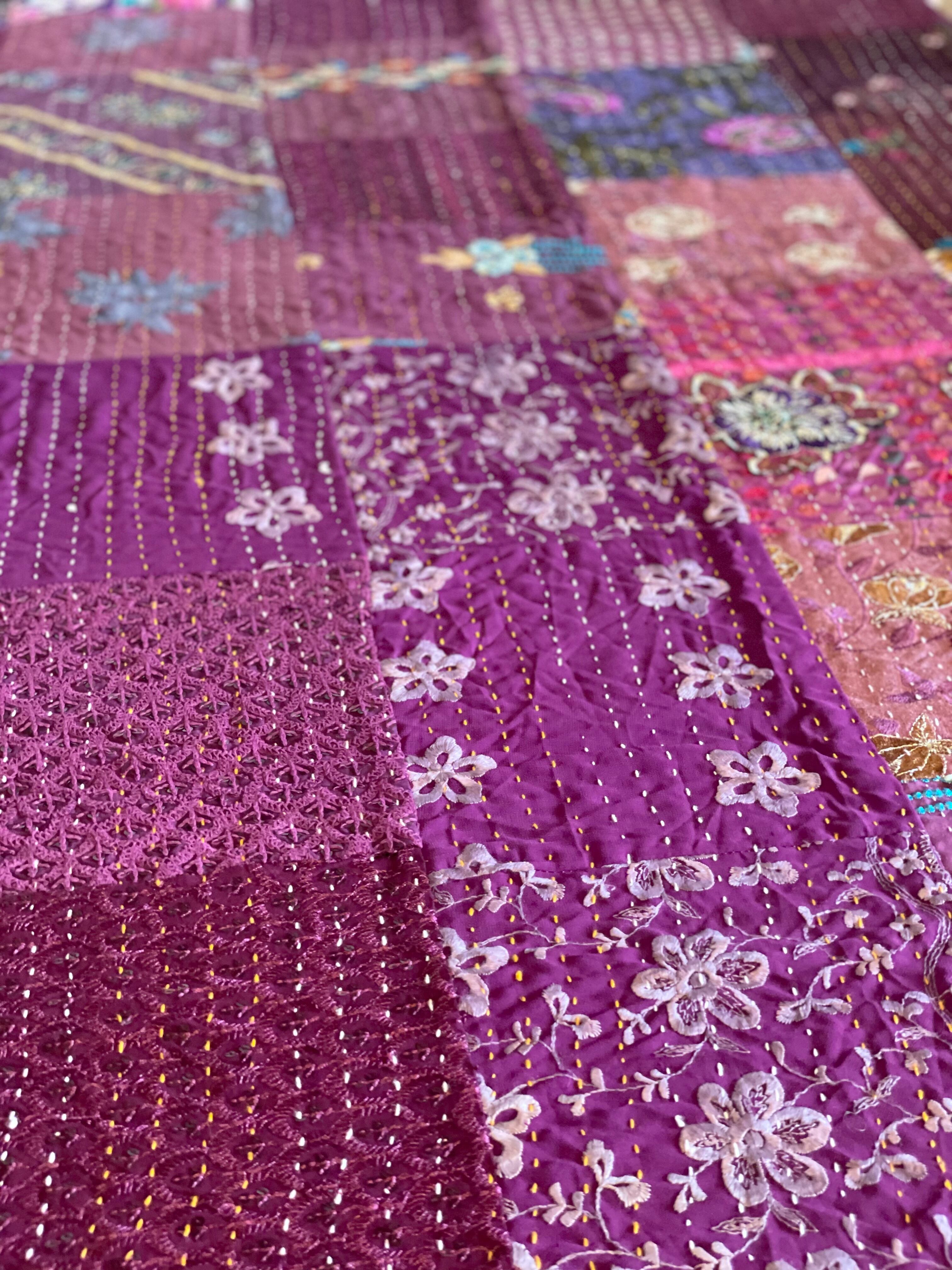 北インドに伝わるカンバディアパッチワーク。サリーやクルタなど、華やかな刺繍やビーズが施された伝統衣装の希少なヴィンテージ布をひとつひとつ手でつなぎ合わせた生地です。