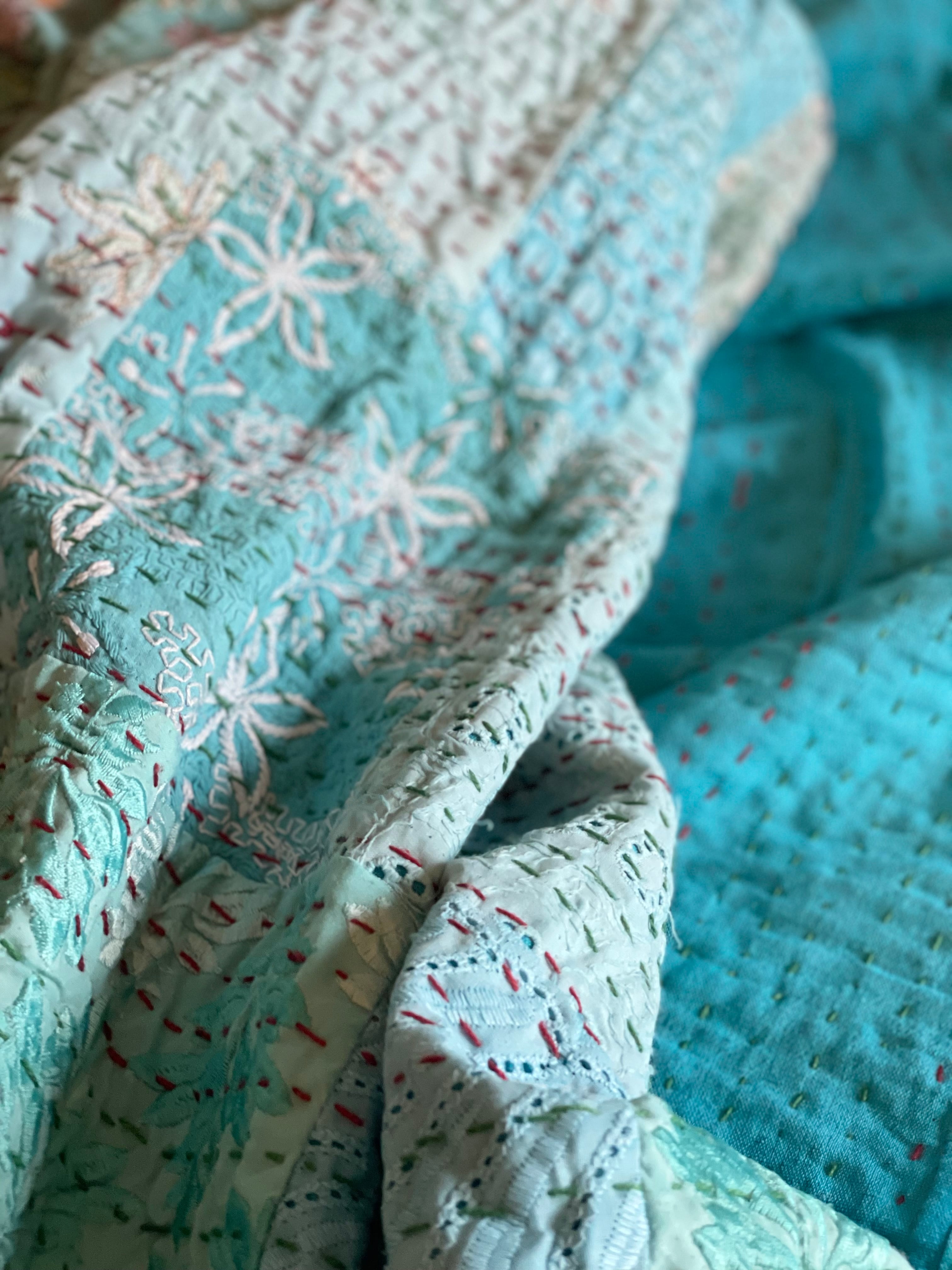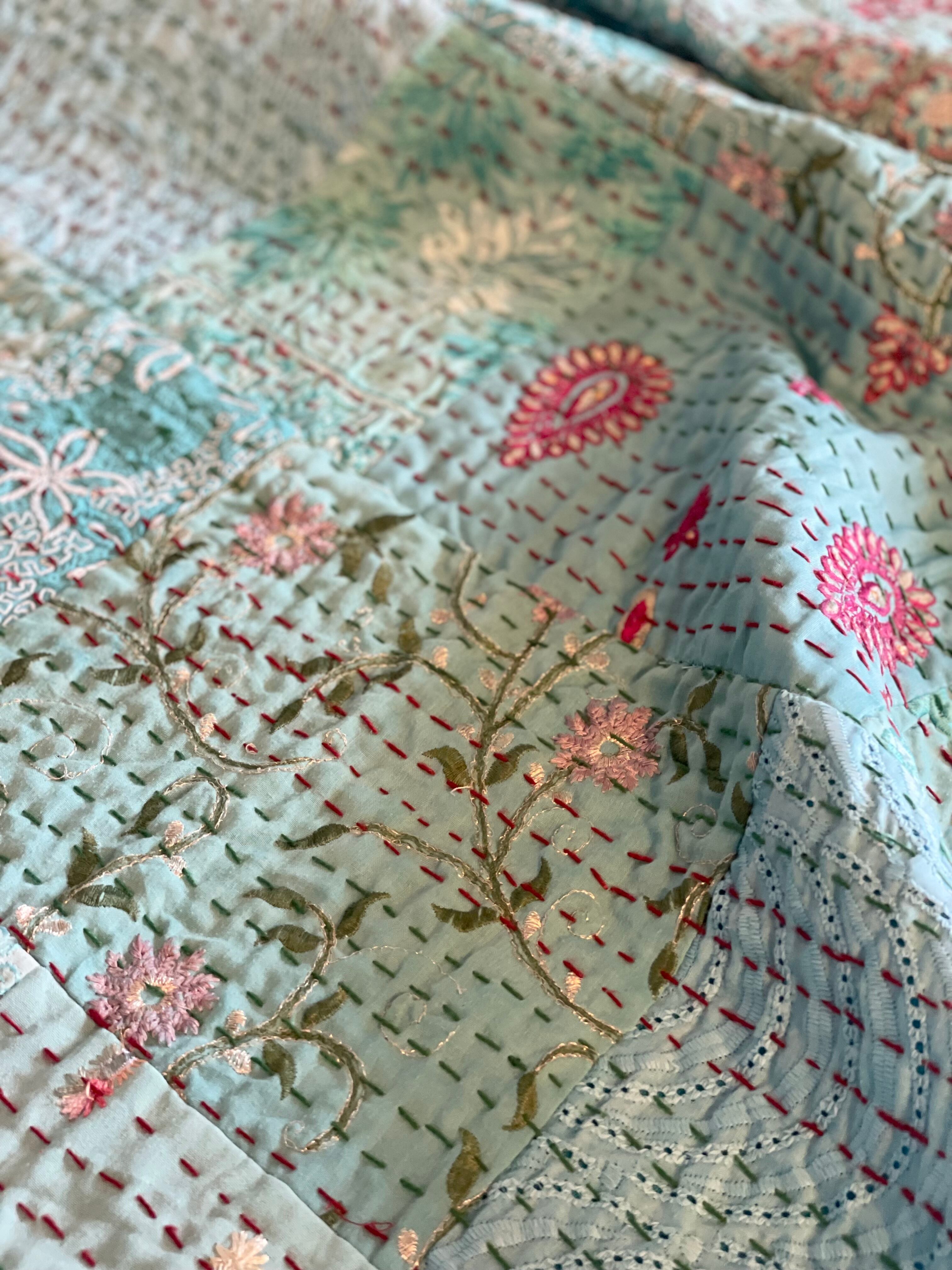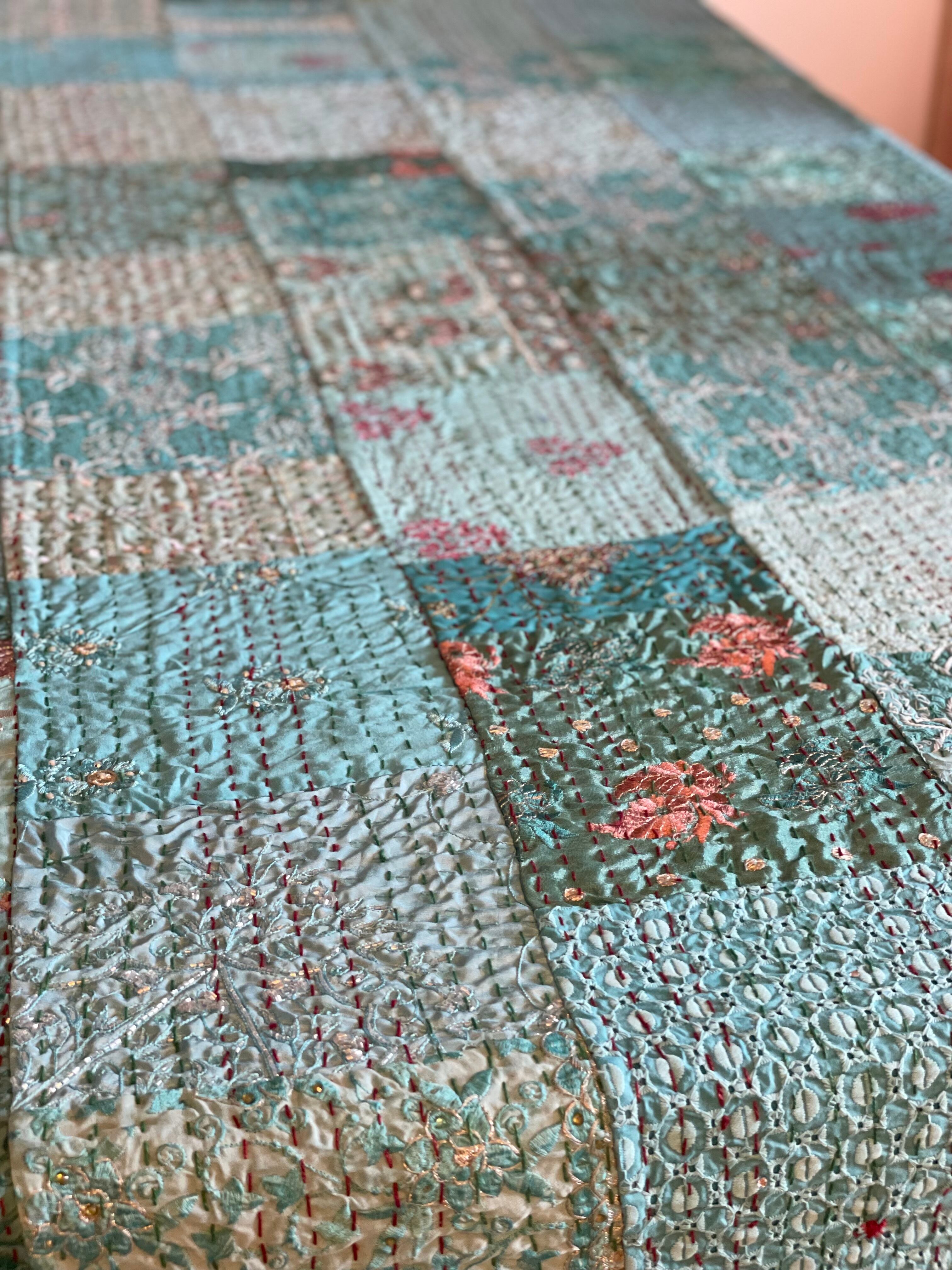 北インドに伝わるカンバディアパッチワーク。サリーやクルタなど、華やかな刺繍やビーズが施された伝統衣装の希少なヴィンテージ布をひとつひとつ手でつなぎ合わせた生地です。