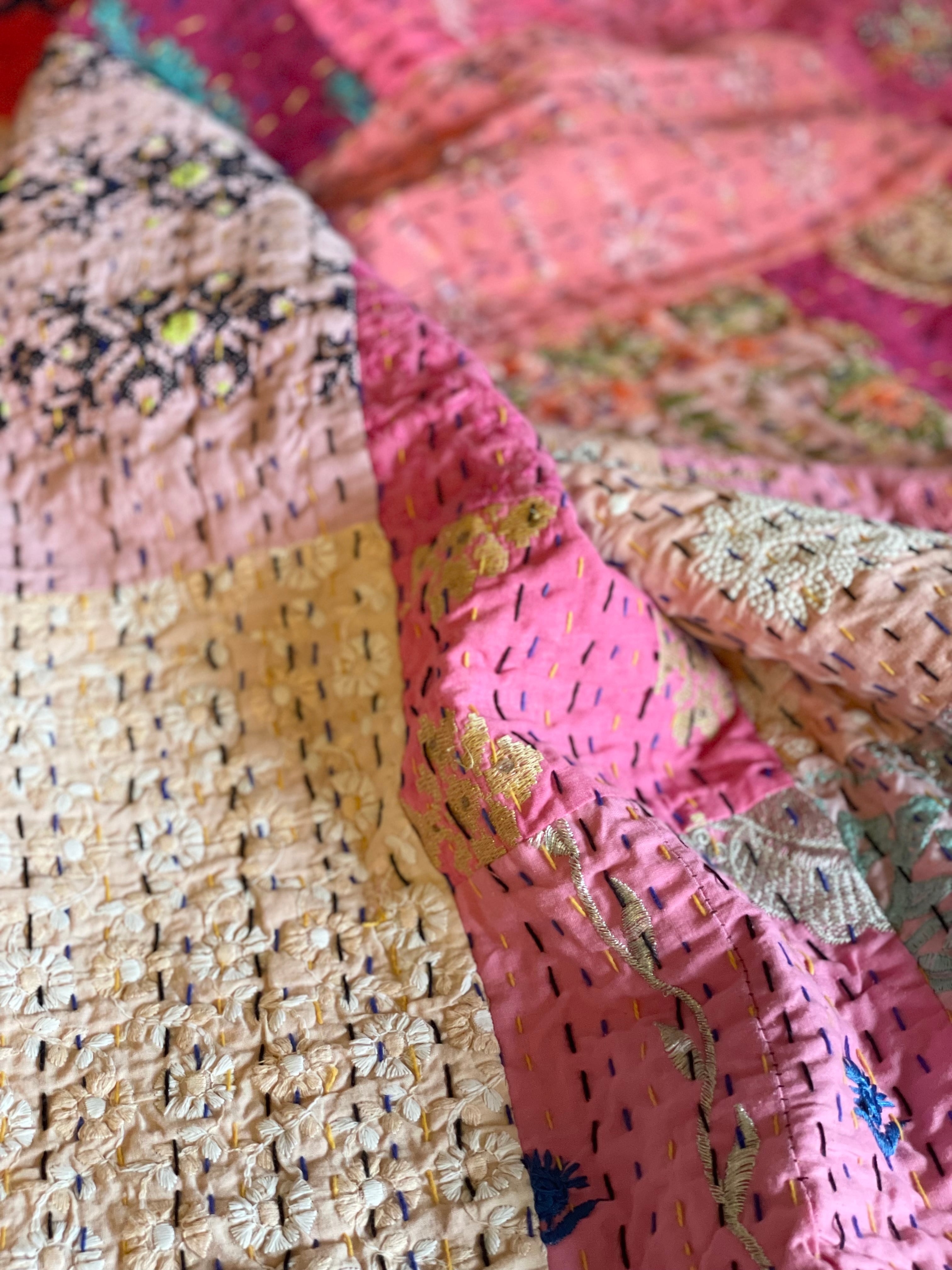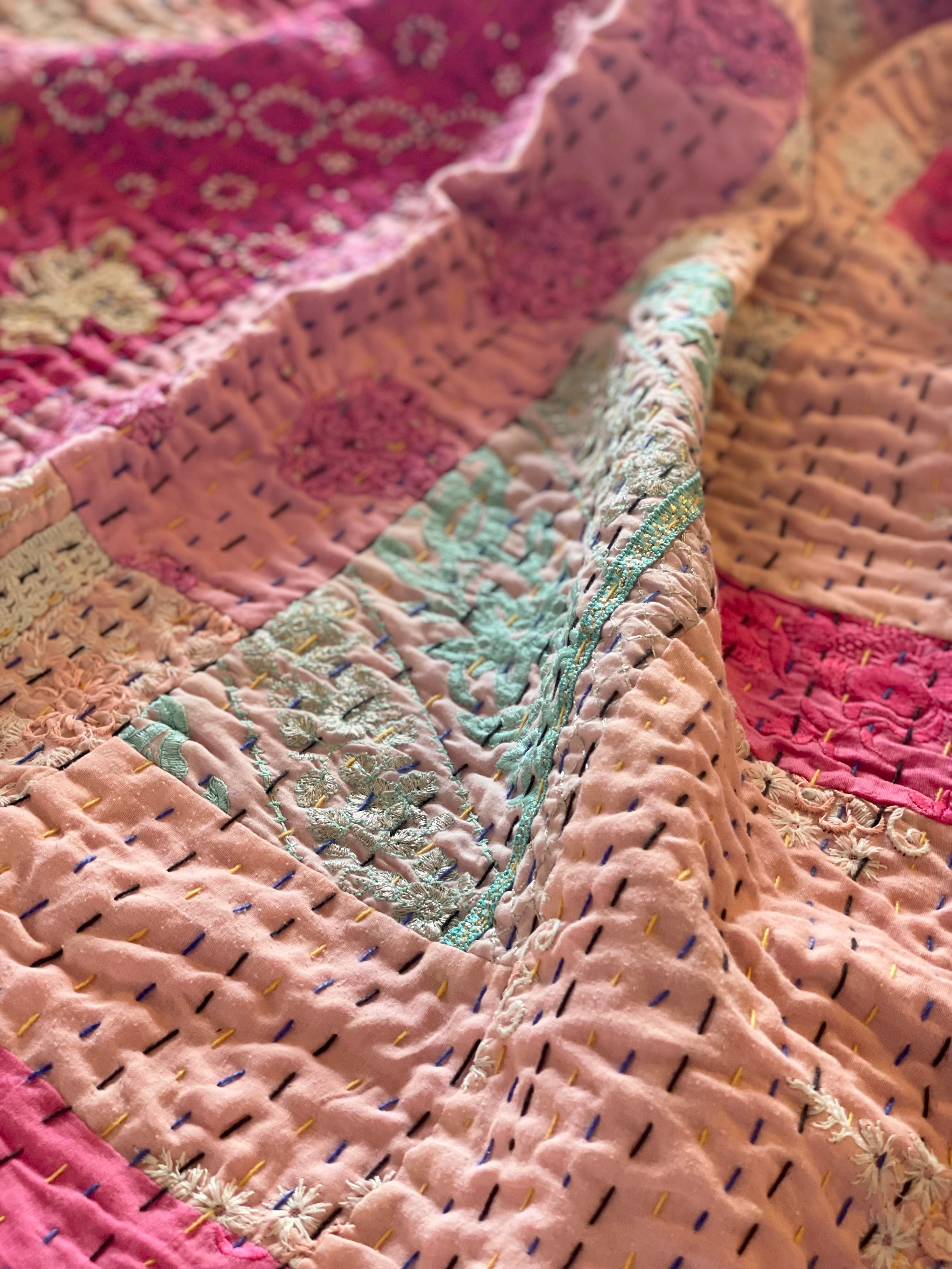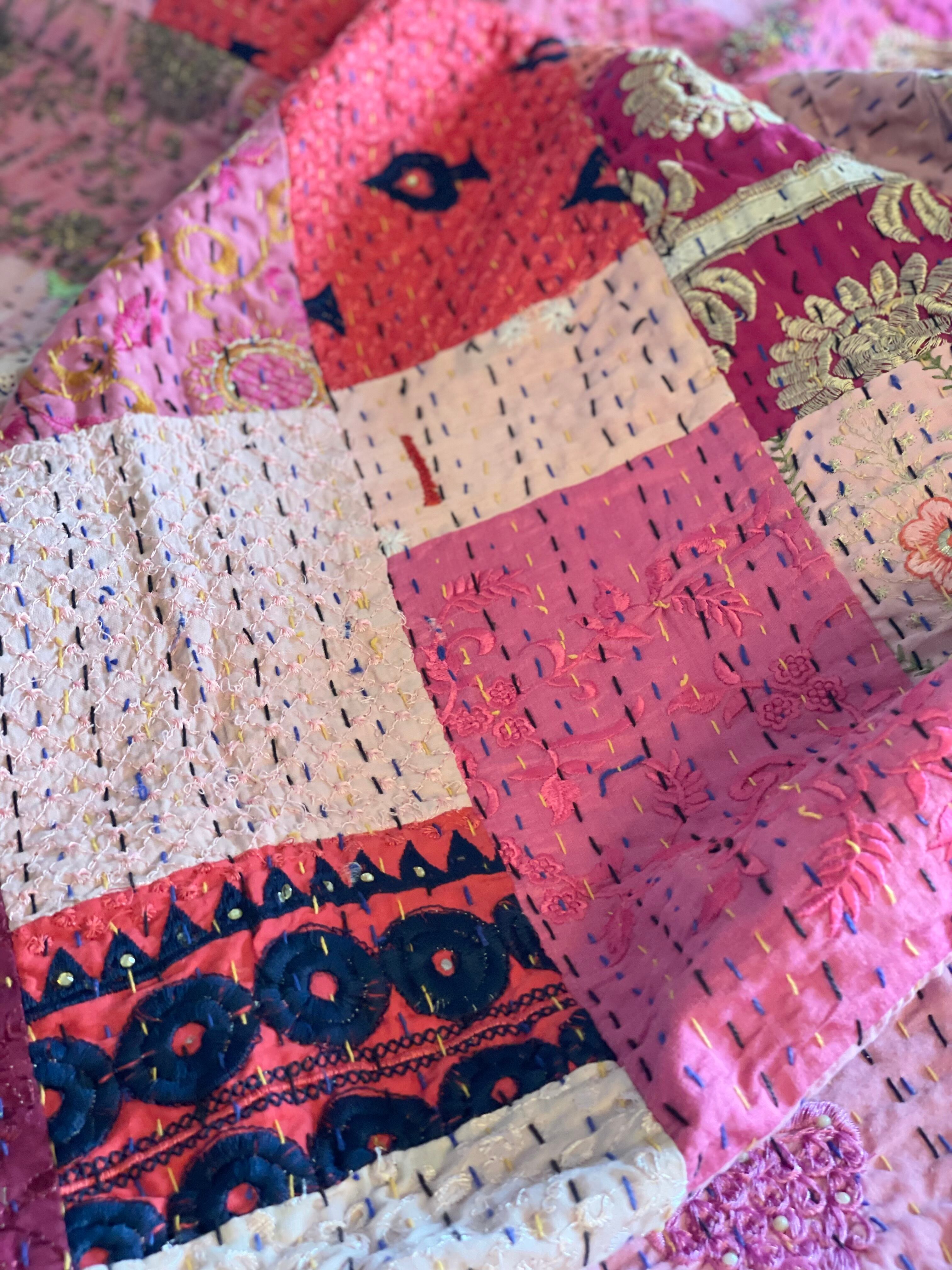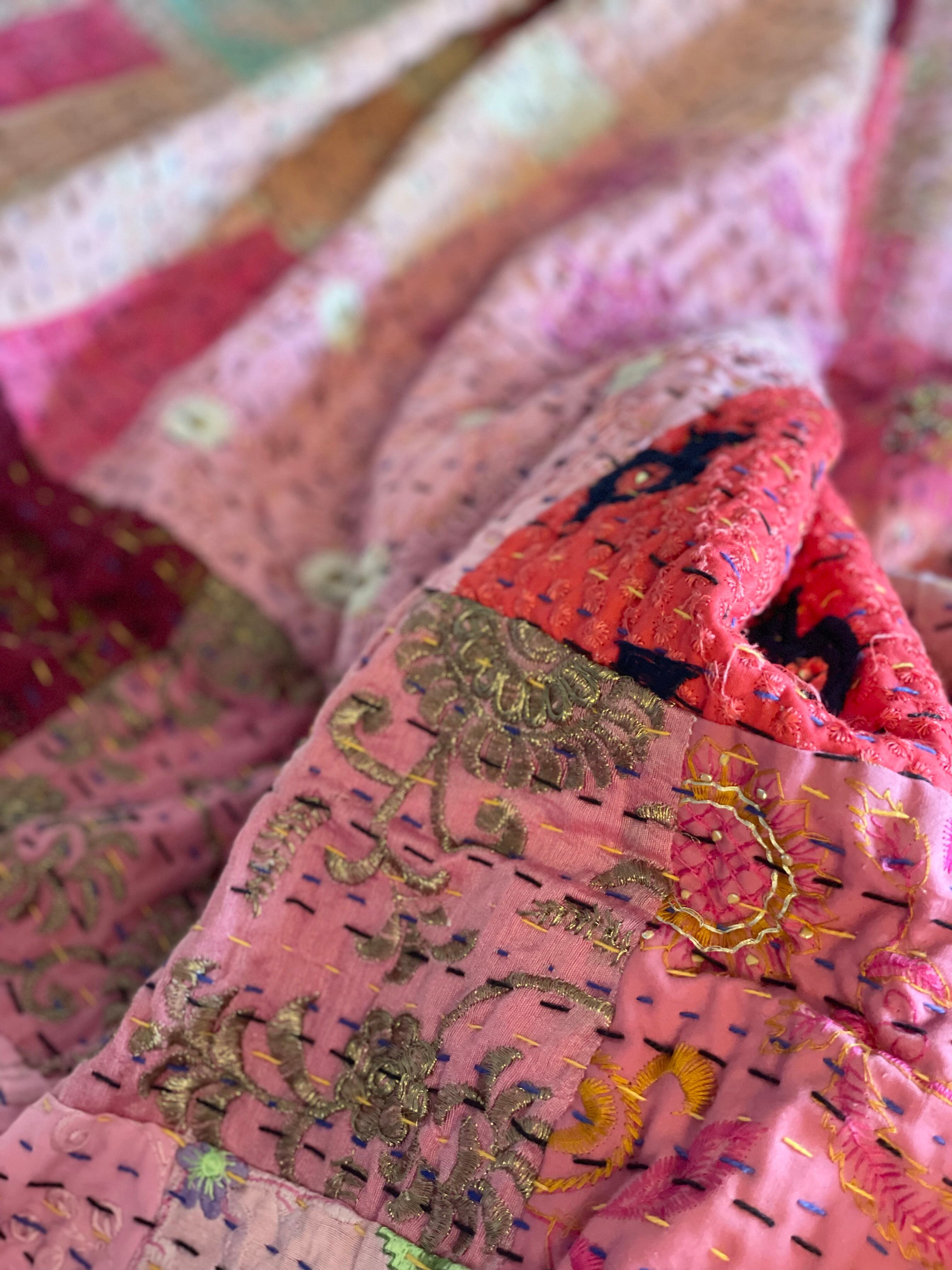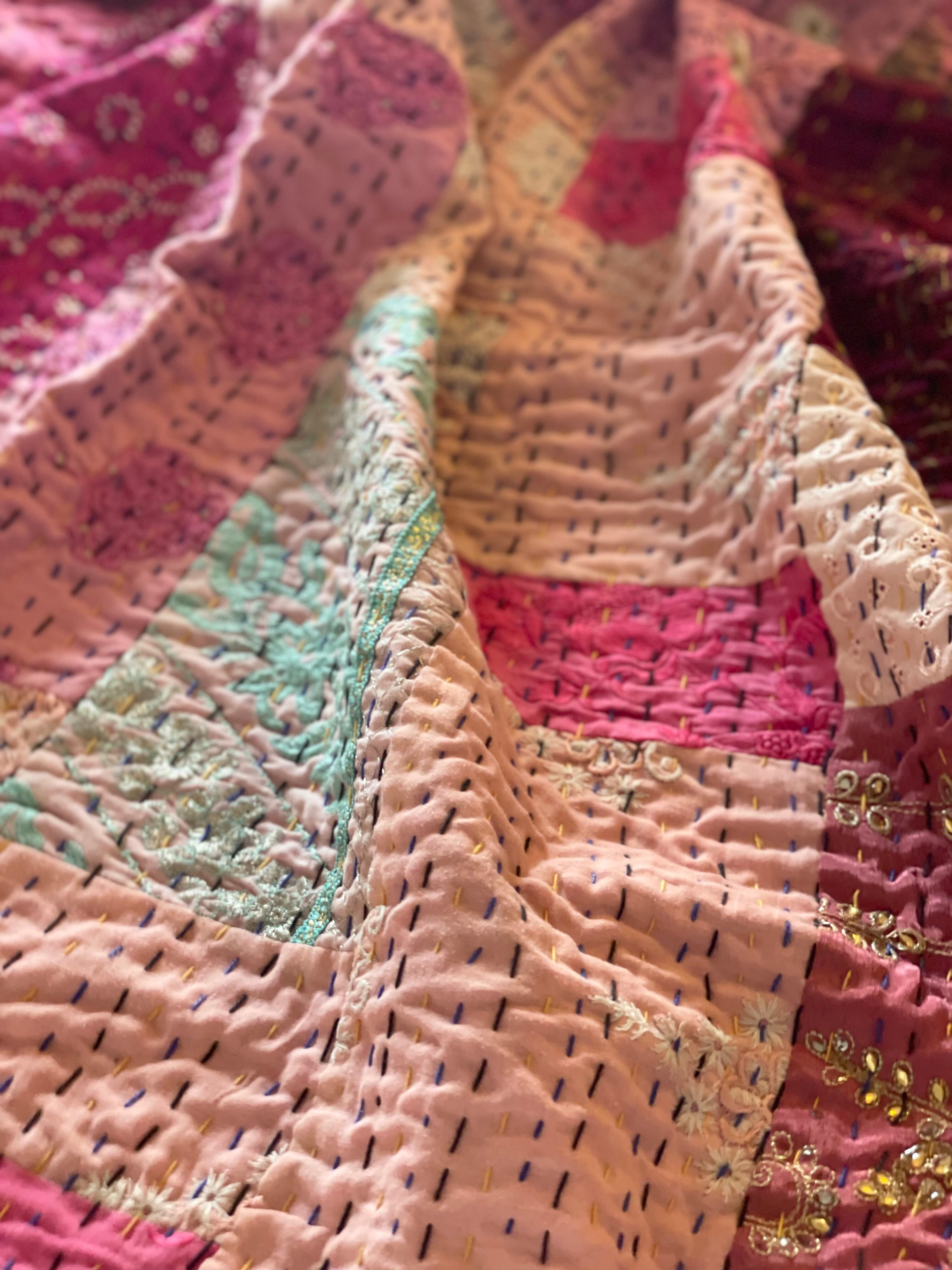北インドに伝わるカンバディアパッチワーク。サリーやクルタなど、華やかな刺繍やビーズが施された伝統衣装の希少なヴィンテージ布をひとつひとつ手でつなぎ合わせた生地です。