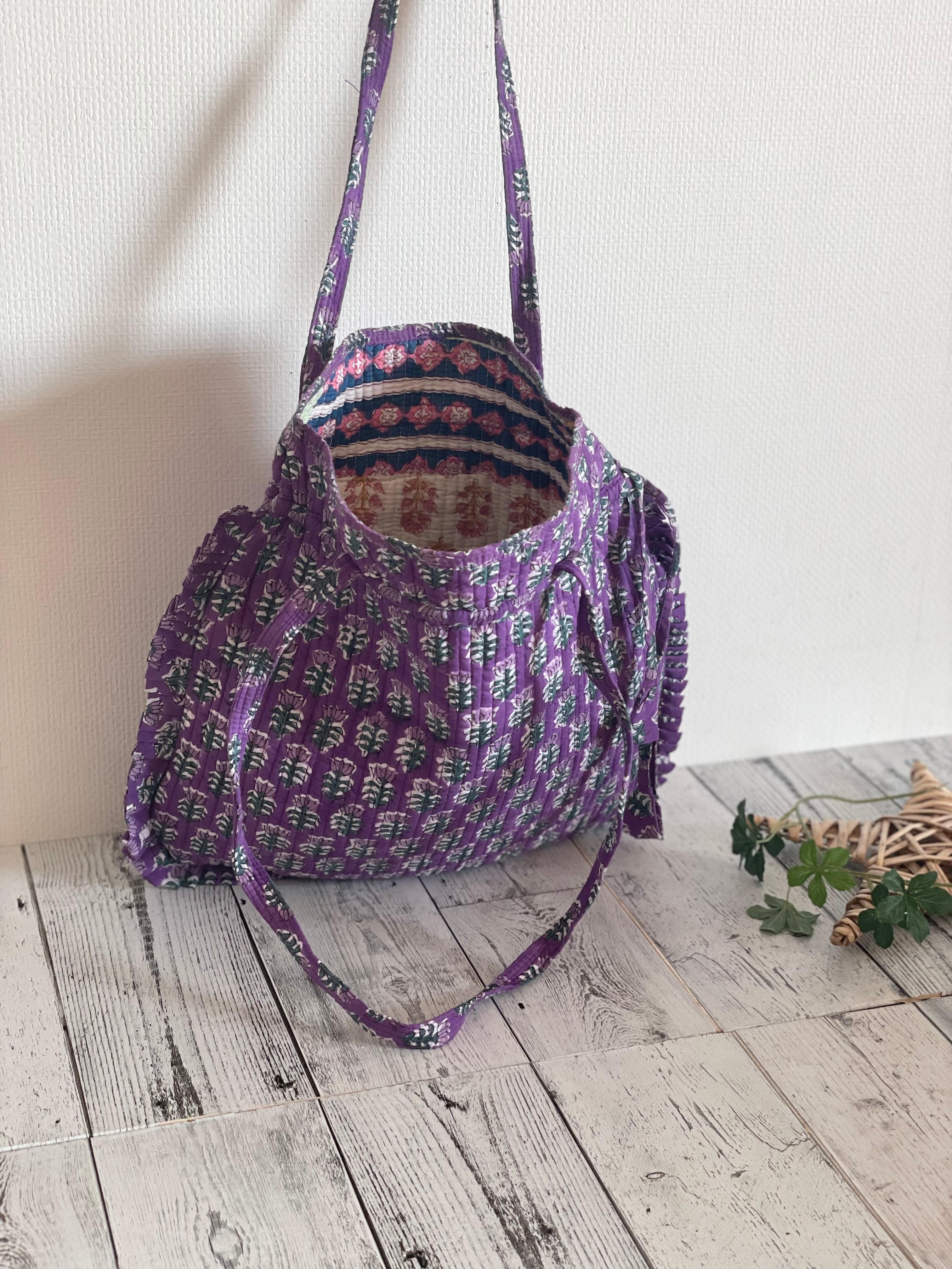 まわりのフリルが愛らしく、ブロックプリントの優しさと上品さが際立つ手提げバッグです。