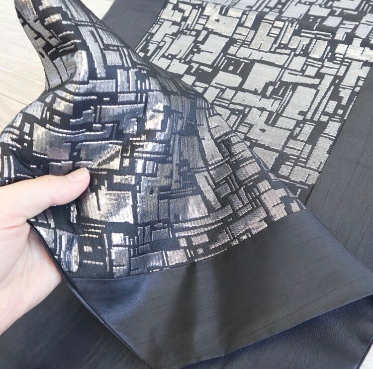 黒とシルバーの色合いがとてもオシャレなテーブルランナーです。しっかり裏地もあり高級感あり。