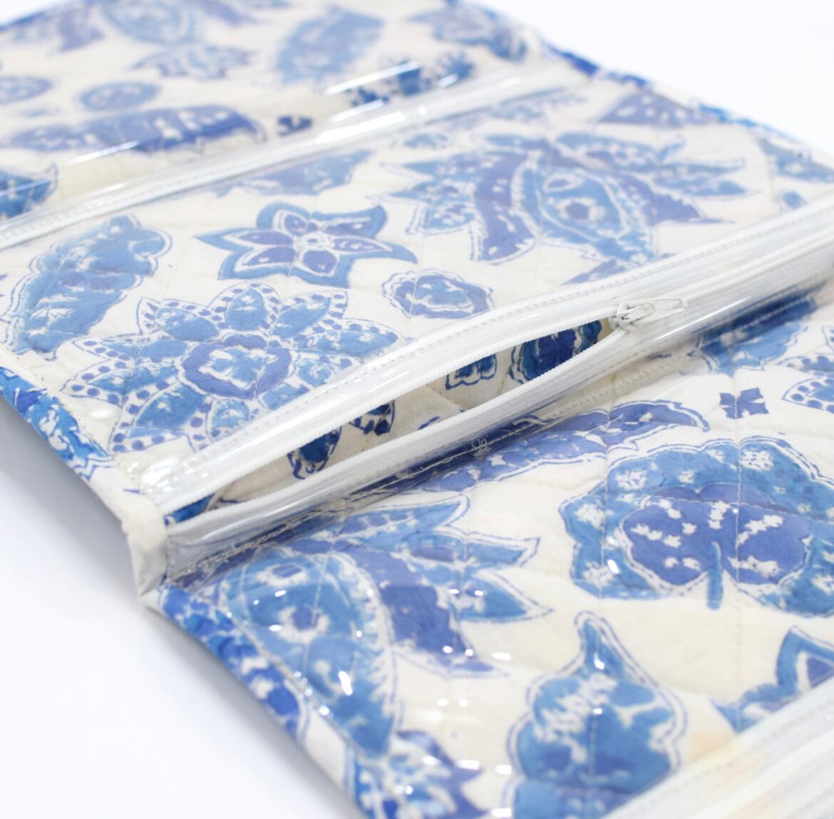 明るい植物模様のキルティング3ポケット トラベルポーチです。