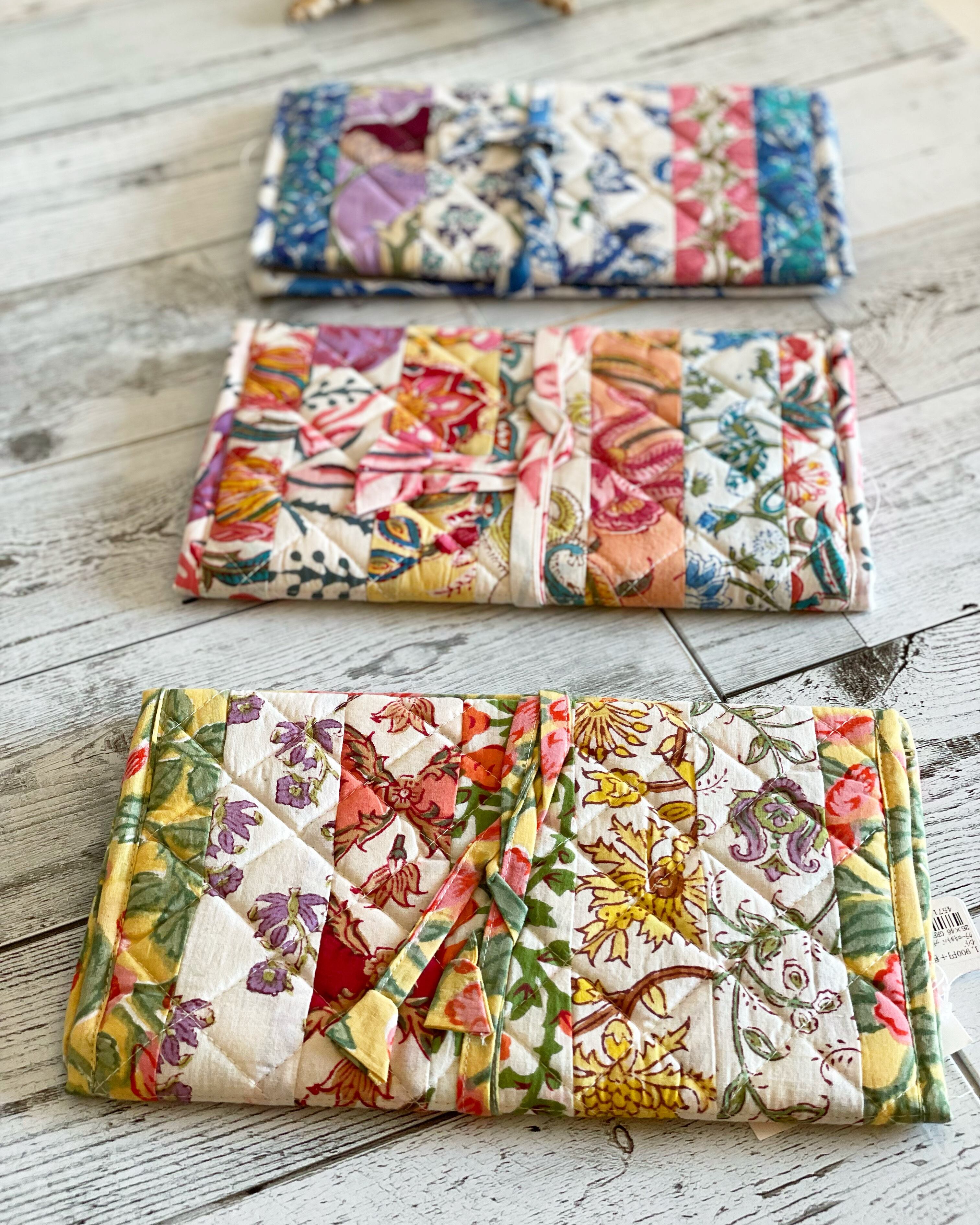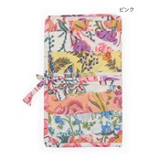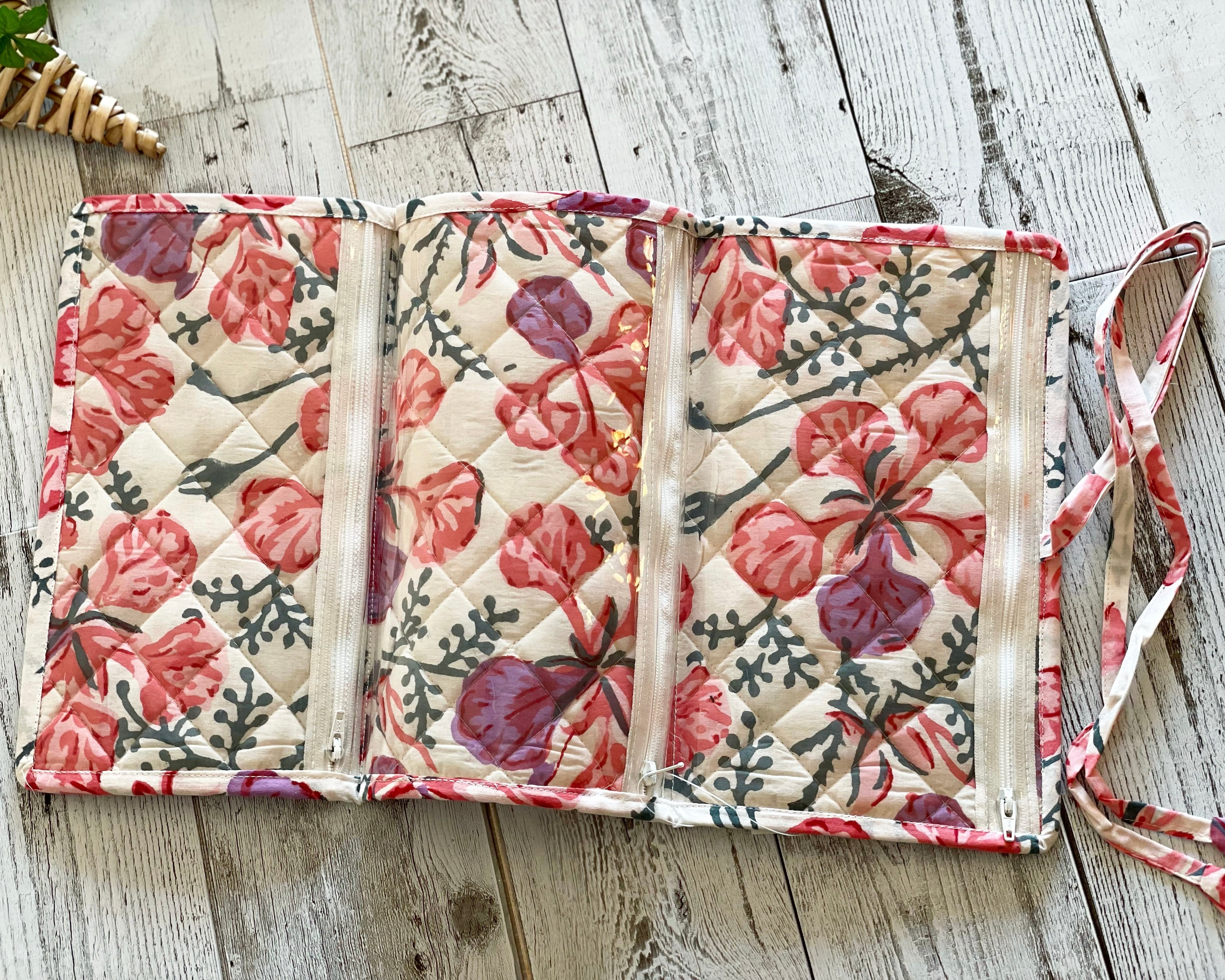 明るい植物模様のキルティング3ポケット トラベルポーチです。