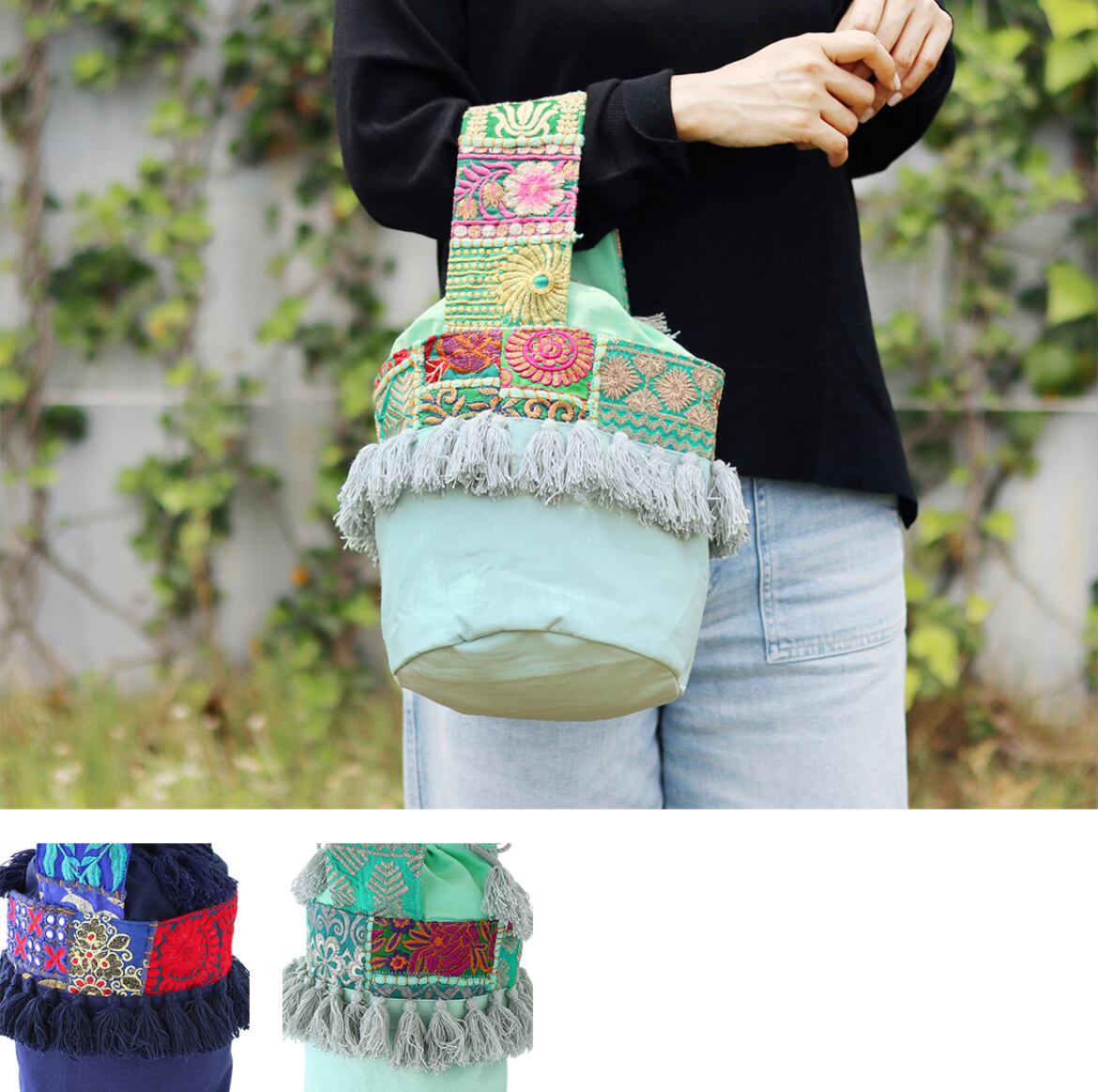インドの古布にフリンジ、装飾が贅沢なシリーズ。オンリーワンの布の組み合わせが楽しい。
