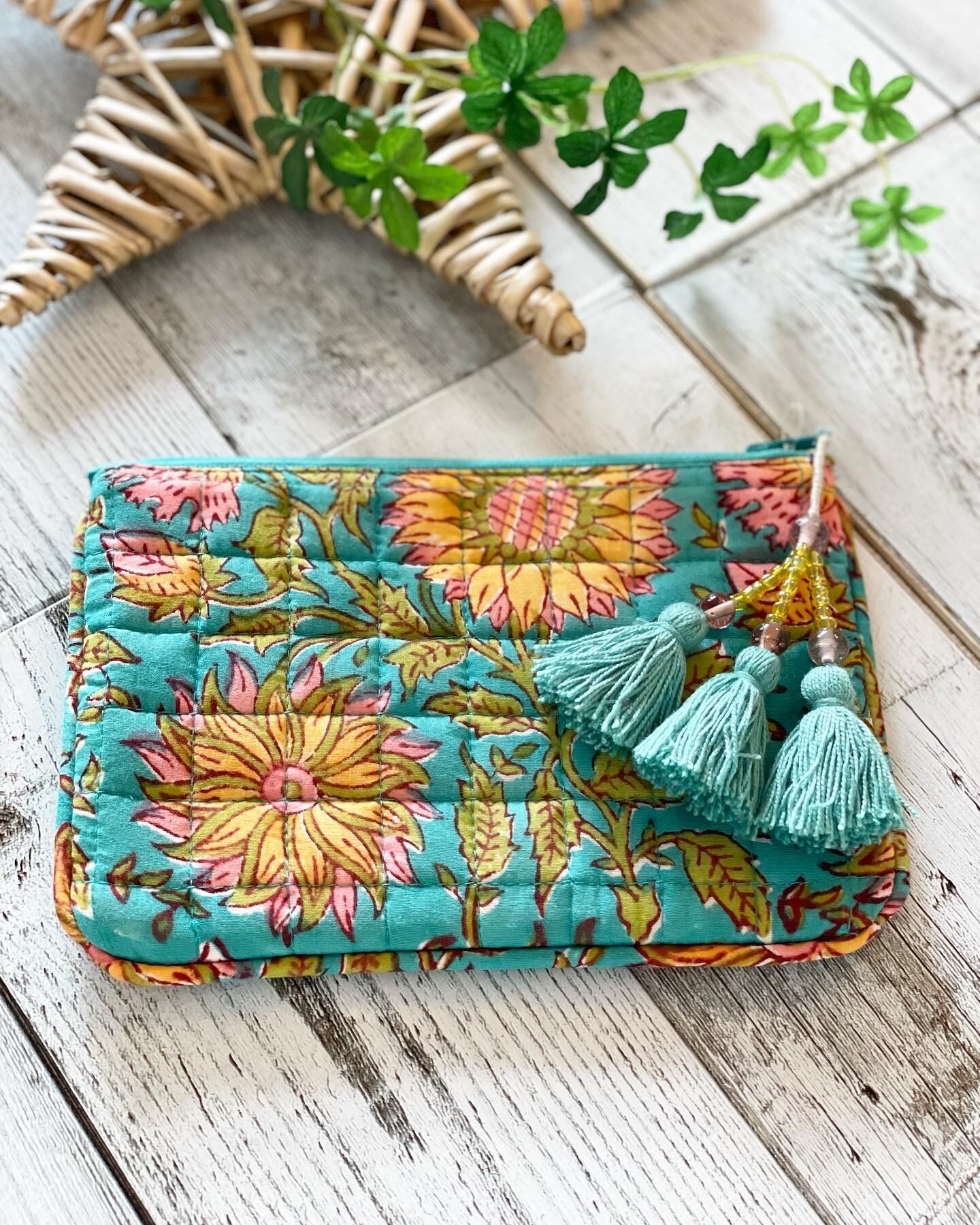 ブロックプリントキルトフラットポーチ ターコイズグリーン