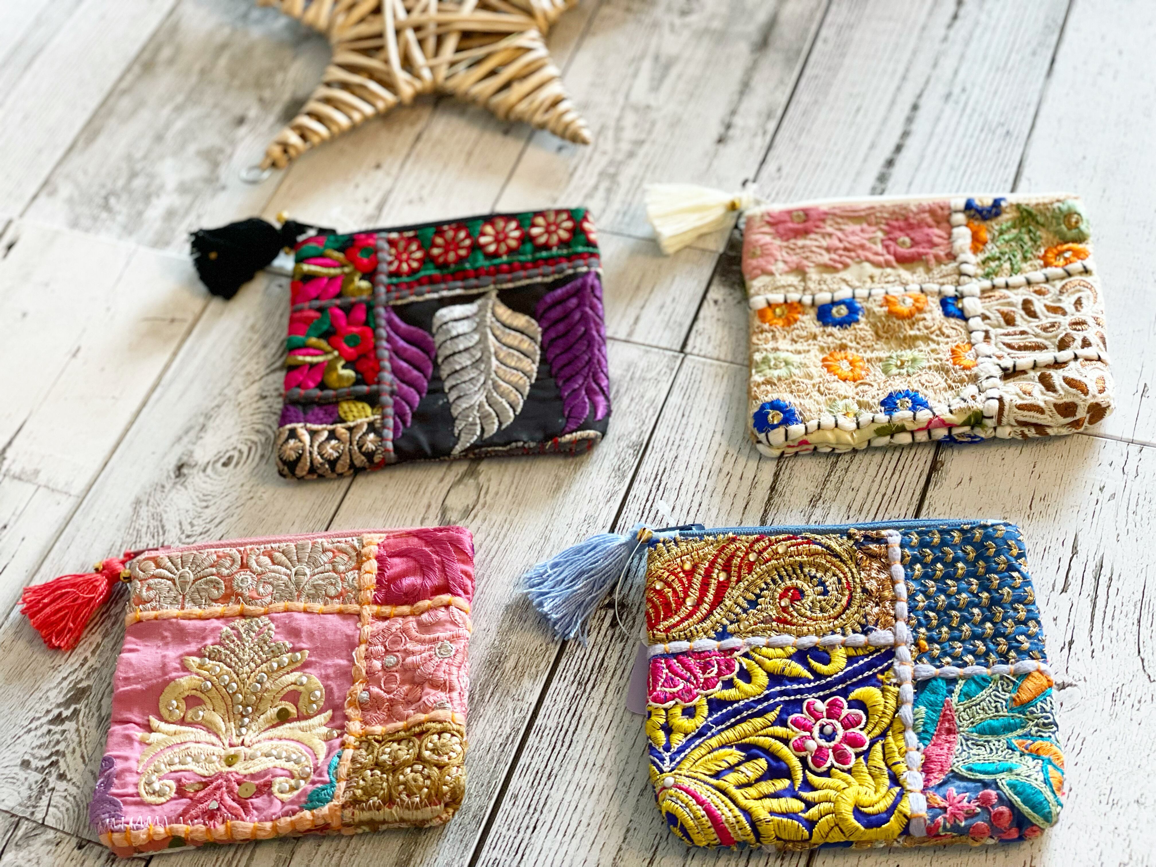インドの古布にフリンジ、鈴など装飾が贅沢なシリーズ。オンリーワンの布の組み合わせが楽しい。