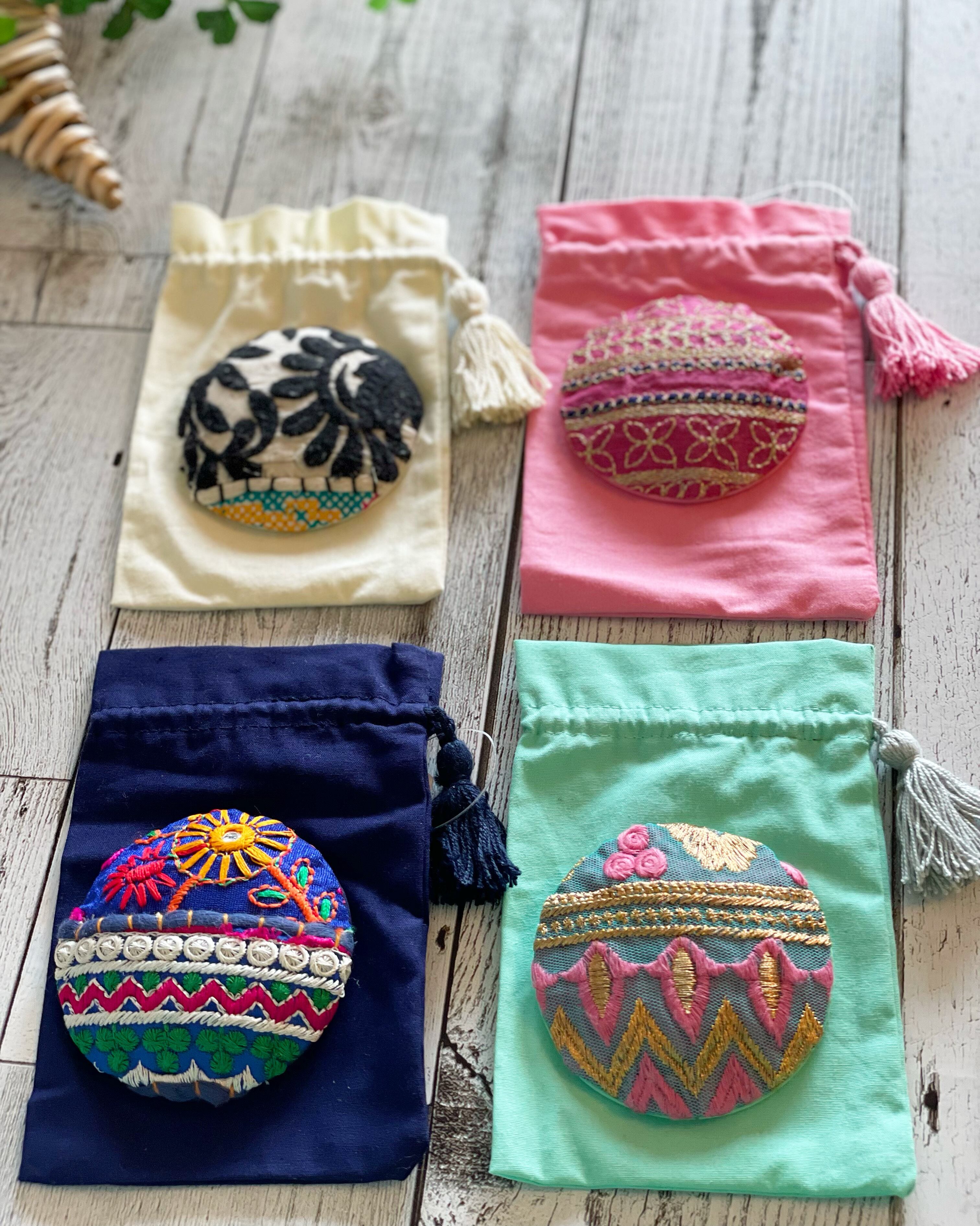インドの民族衣装サリーをはじめとする伝統的な刺繍生地をはぎ合わせて作りました。