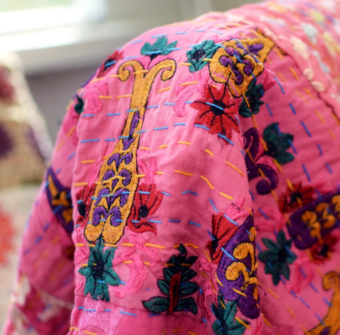 北インドに伝わるカンバディアパッチワーク。サリーやクルタなど、華やかな刺繍やビーズが施された伝統衣装の希少なヴィンテージ布をひとつひとつ手でつなぎ合わせた生地です。