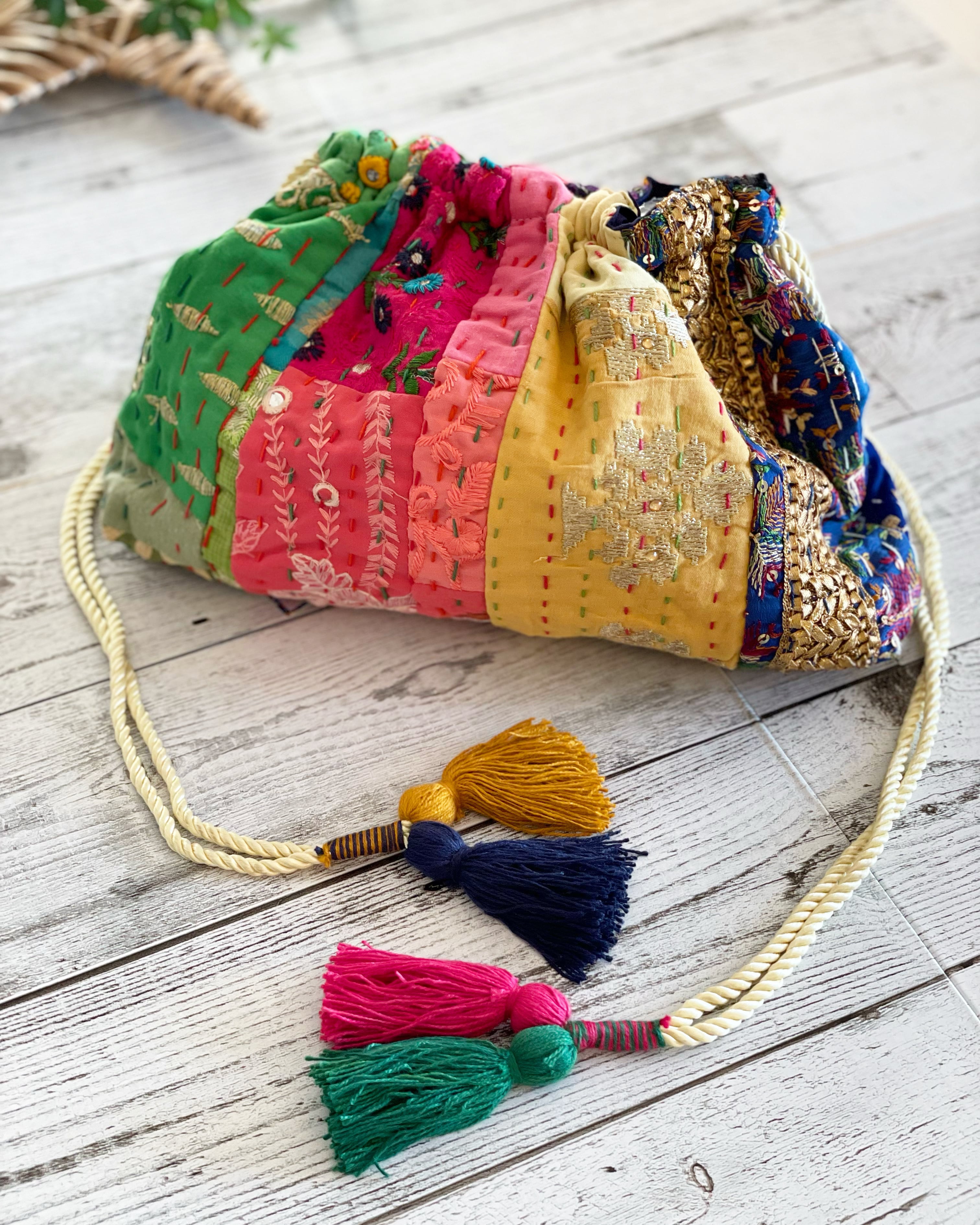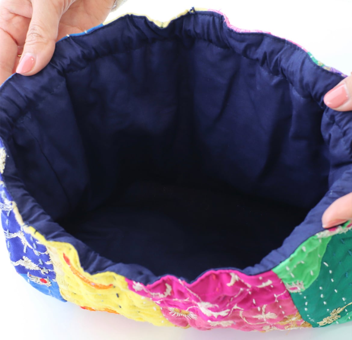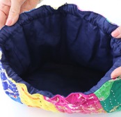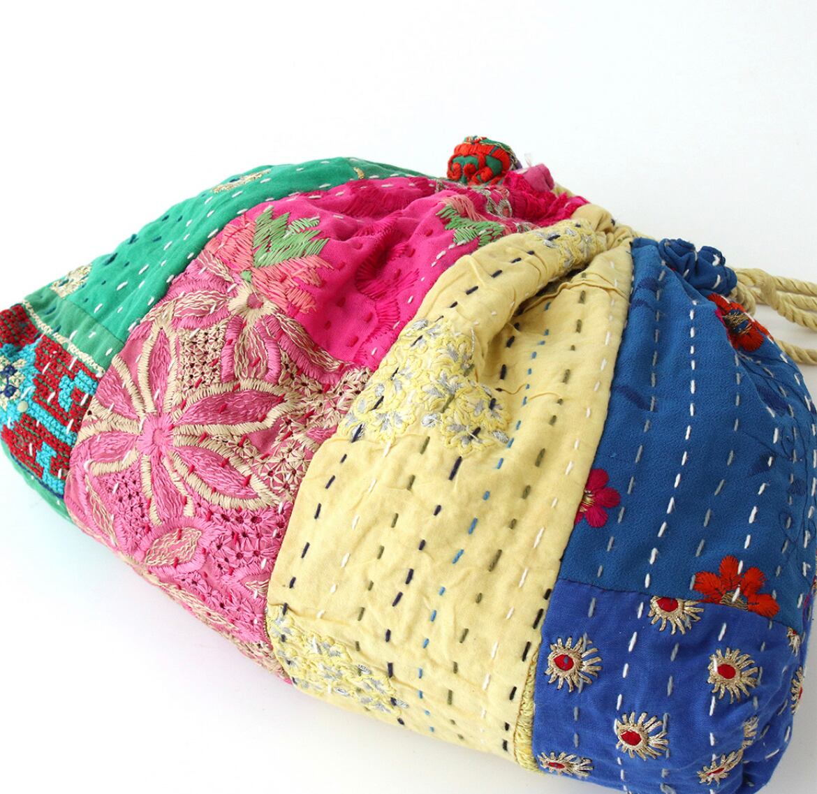 サリーなどの古布をパッチワークした生地にラリーステッチ(刺し子)を施した巾着バッグです。