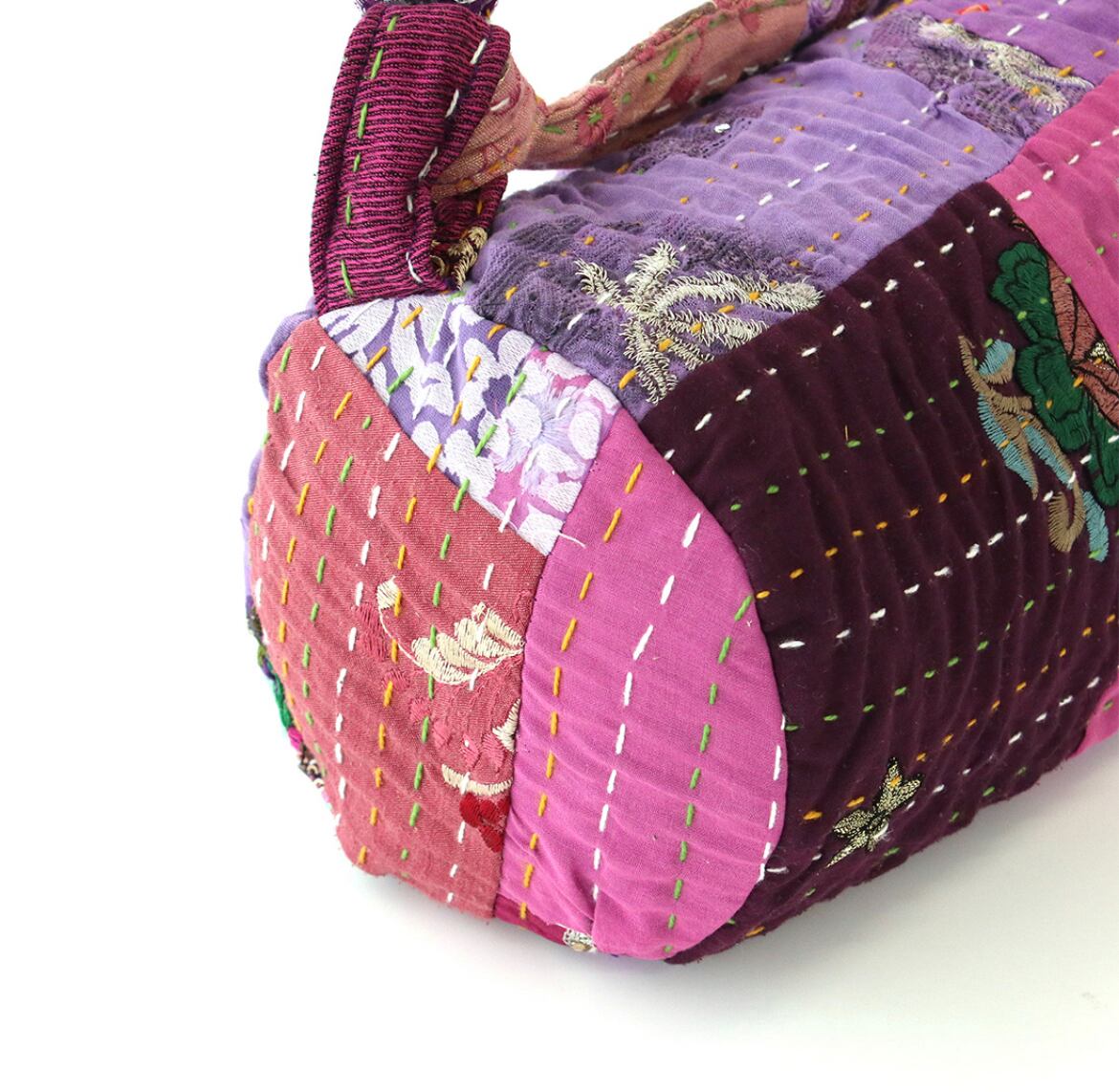 サリーなどの古布をパッチワークした生地にラリーステッチ(刺し子)を施したアイテムです。