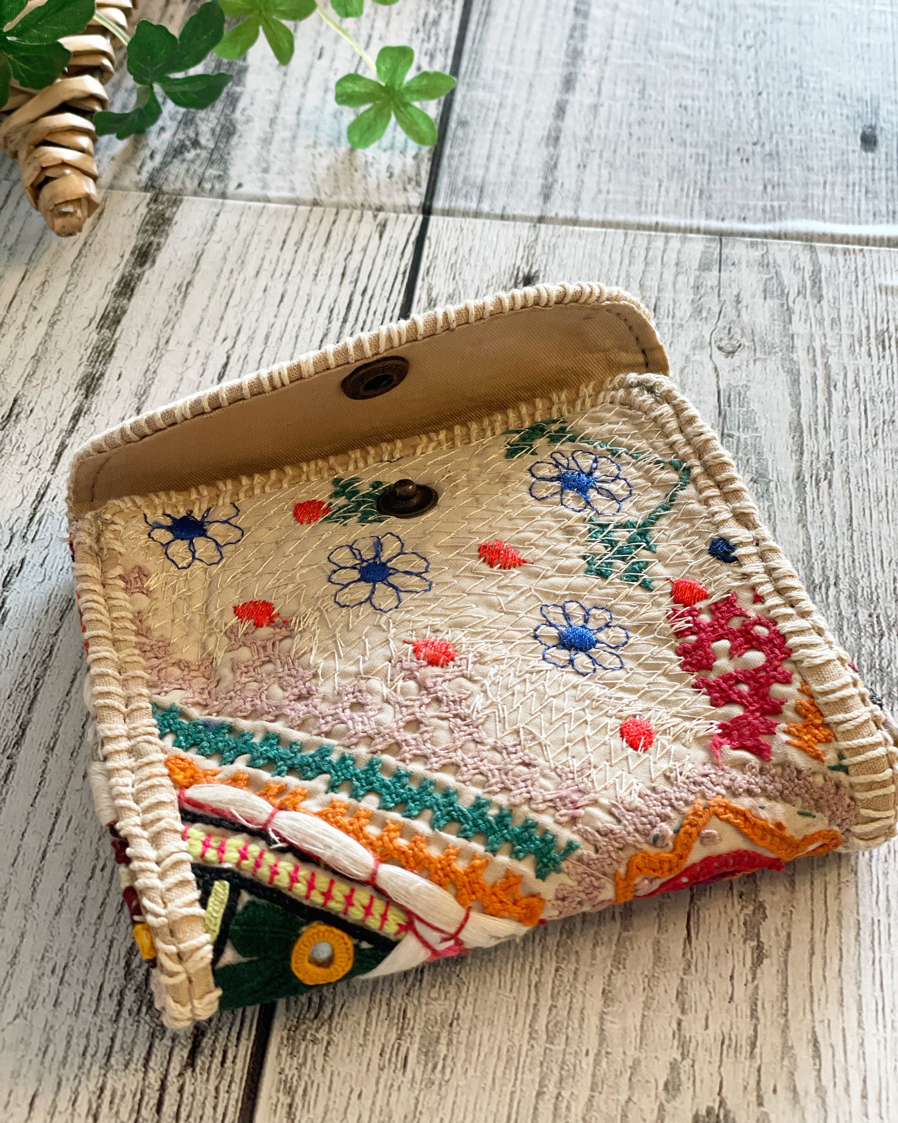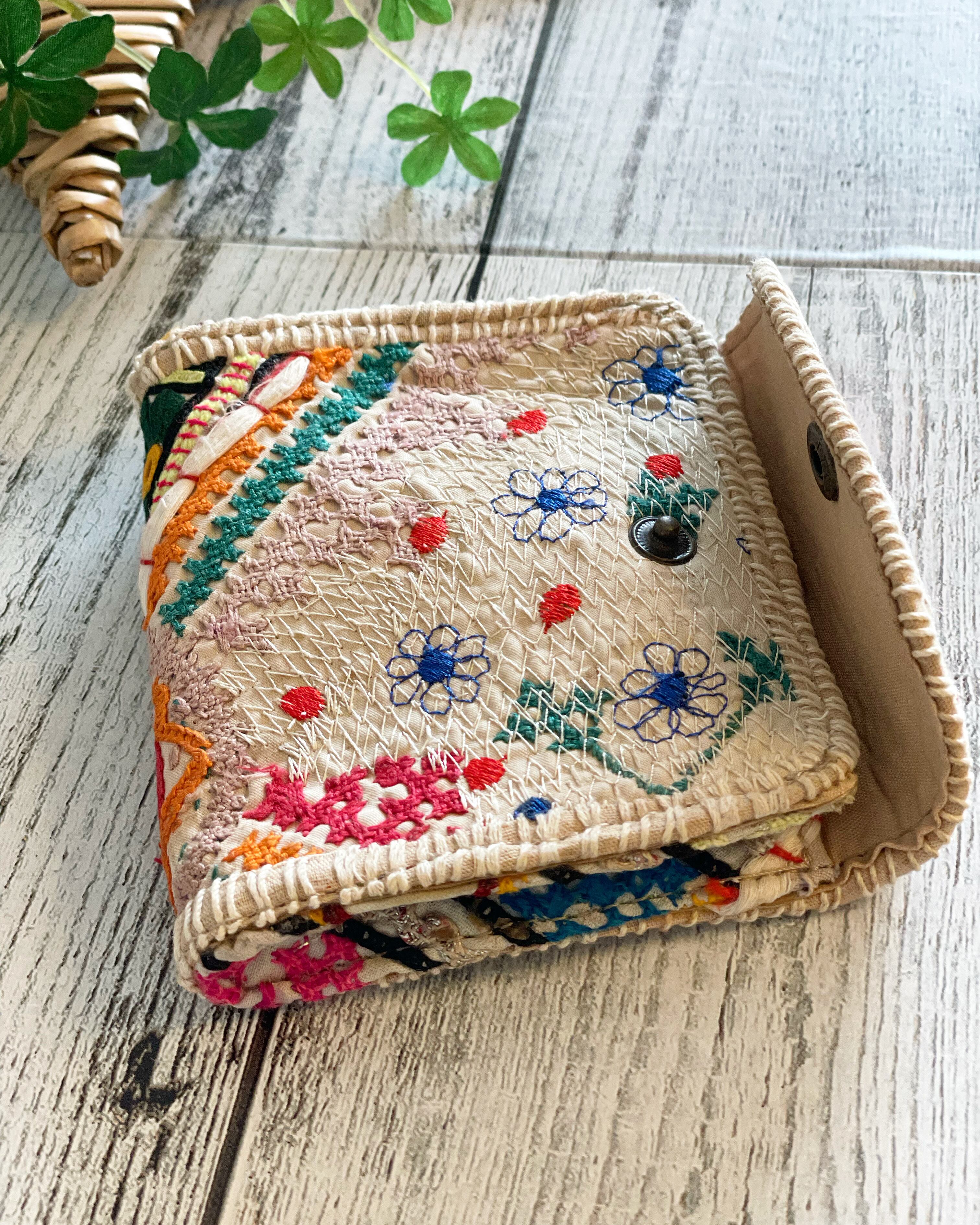 インドとパキスタンの国境近くに住む遊牧民ラバリ族の美しい古布をはぎ合わせて作りました。