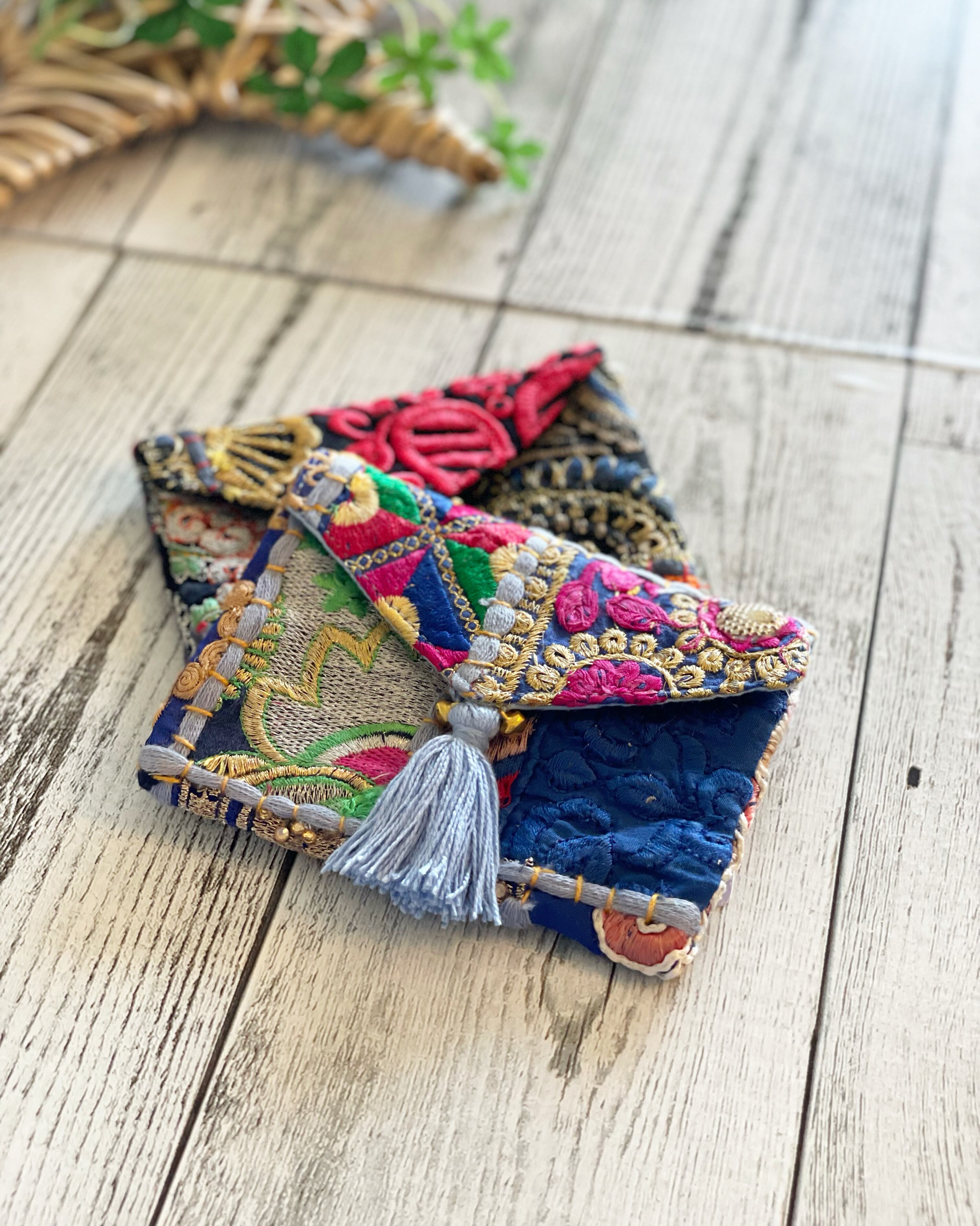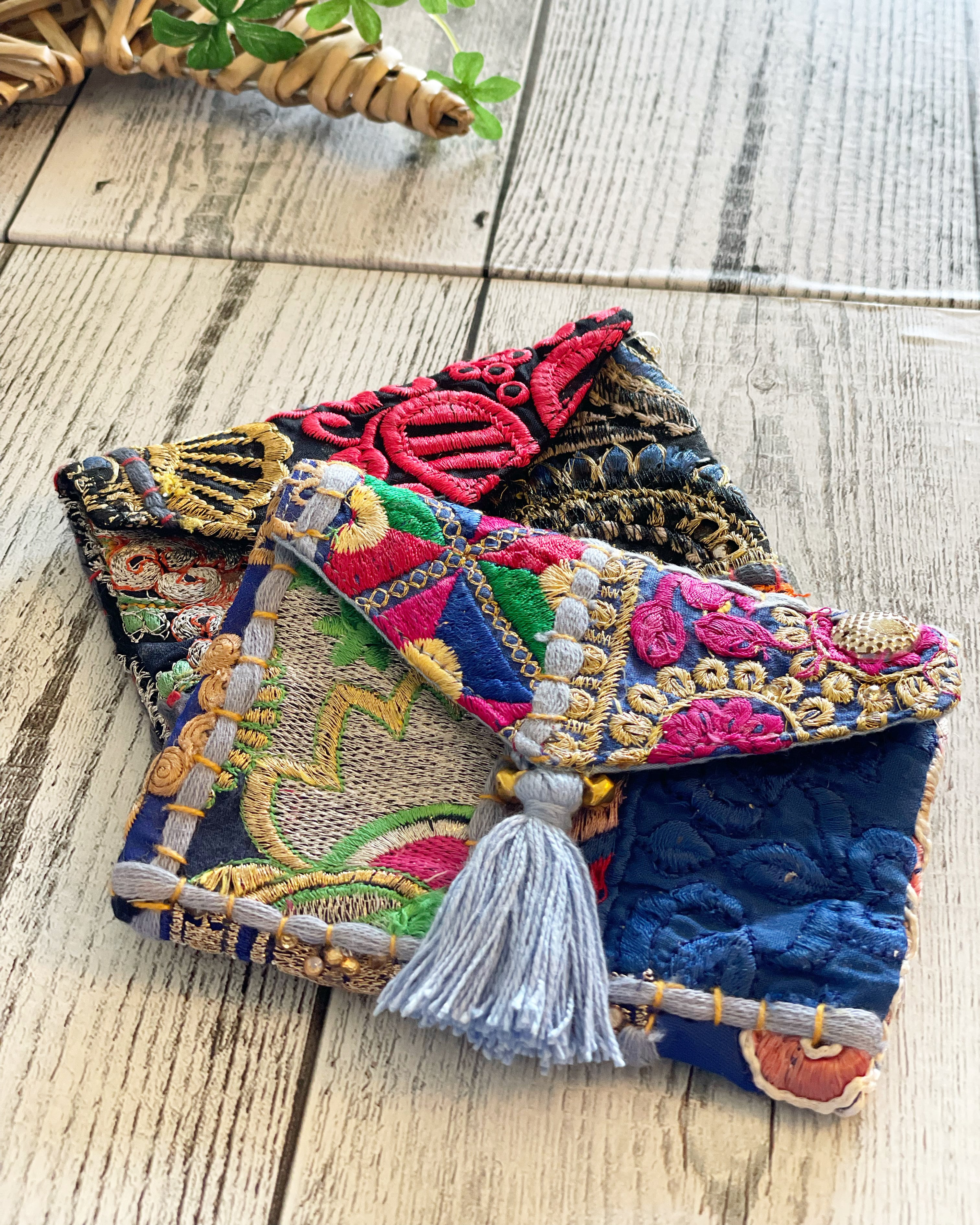 インドの古布にフリンジ、鈴など装飾が贅沢なシリーズ。オンリーワンの布の組み合わせが楽しい。