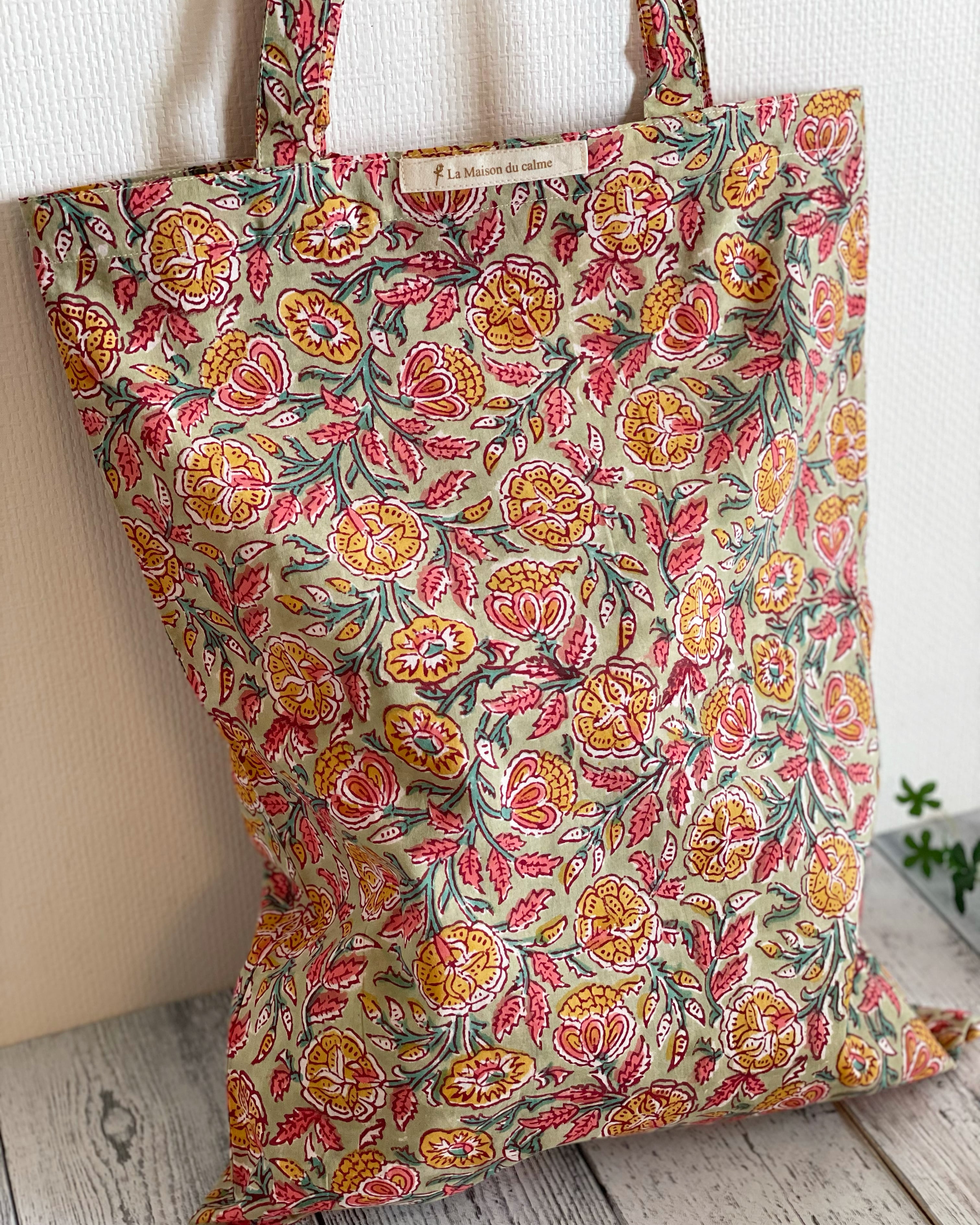 【Shop オリジナル】ブロックプリント エコトートバッグ ライトグリーン 花柄