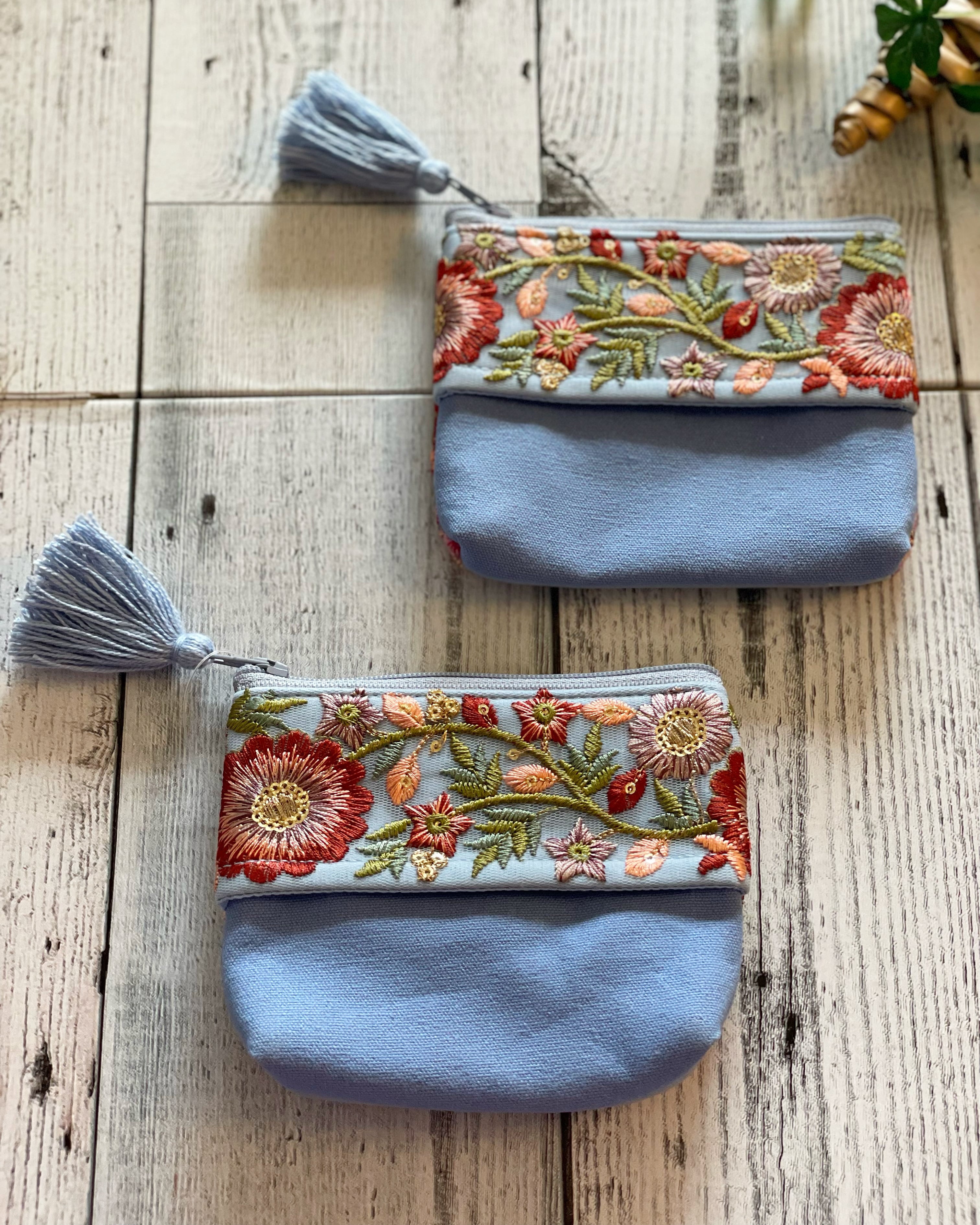 インド刺繍リボン ティッシュケース付ポーチ グレイッシュブルー