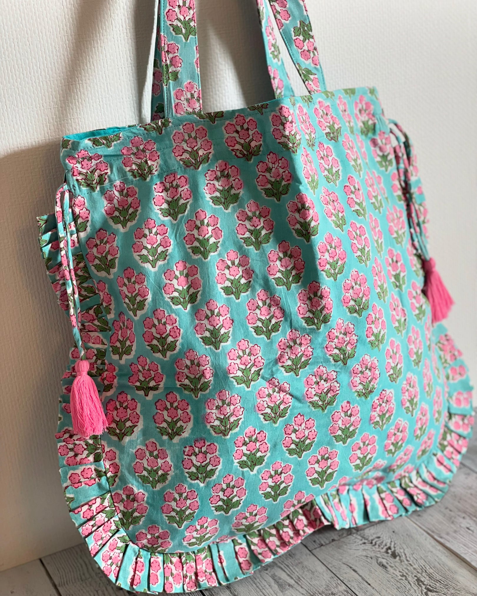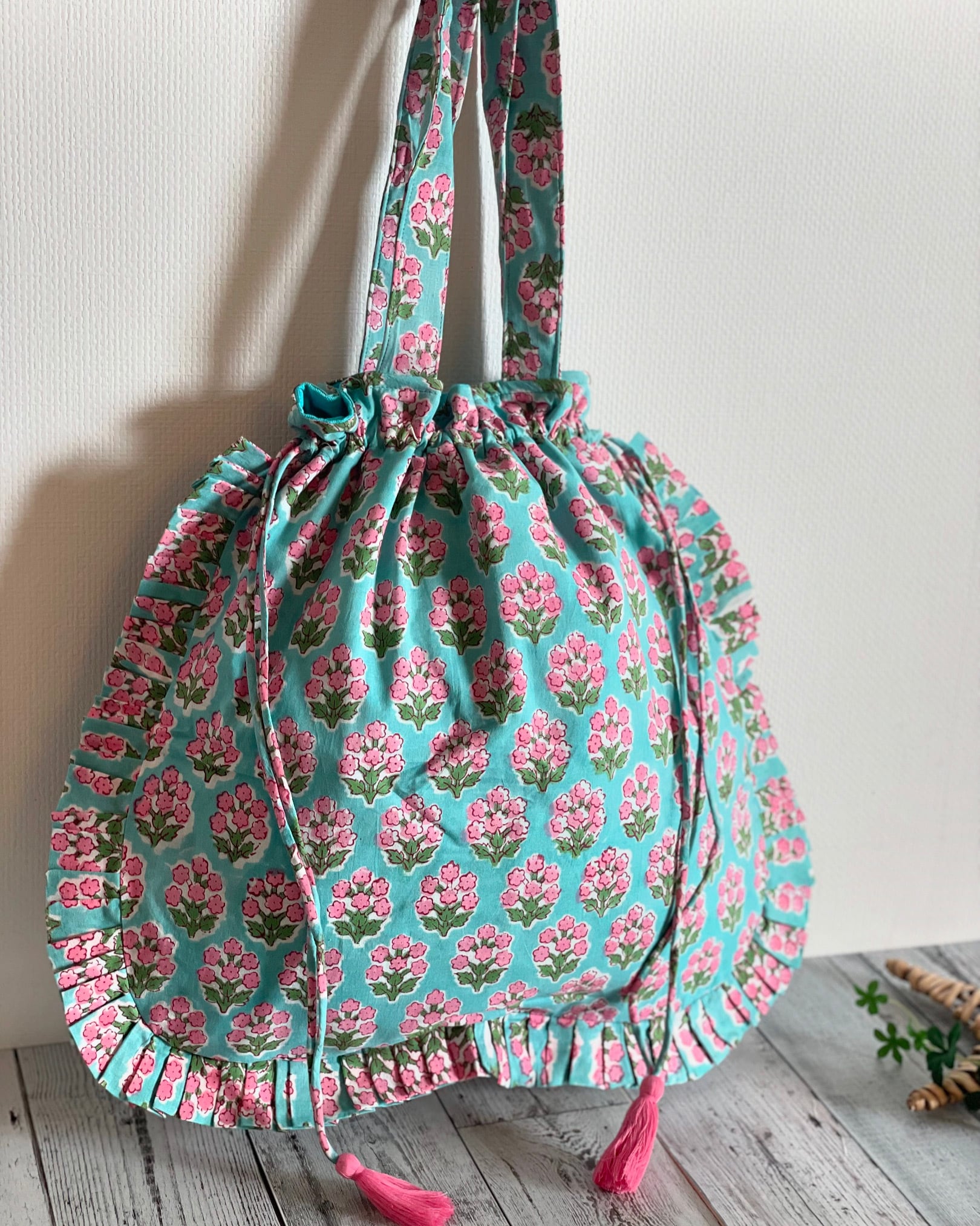 まわりのフリルが愛らしく、ブロックプリントの優しさと上品さが際立つ手提げバッグです。