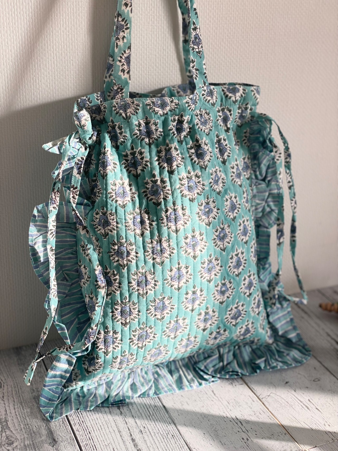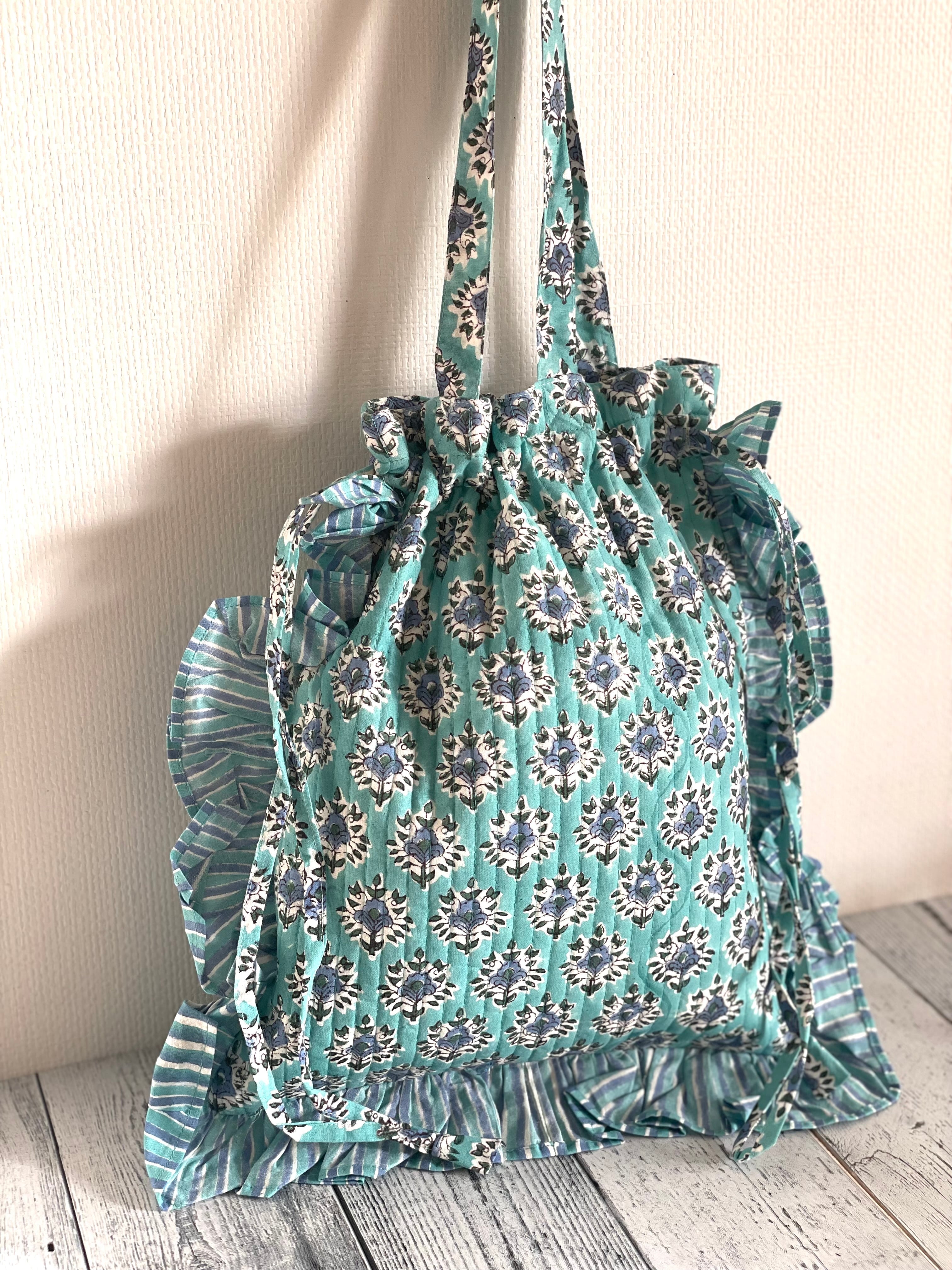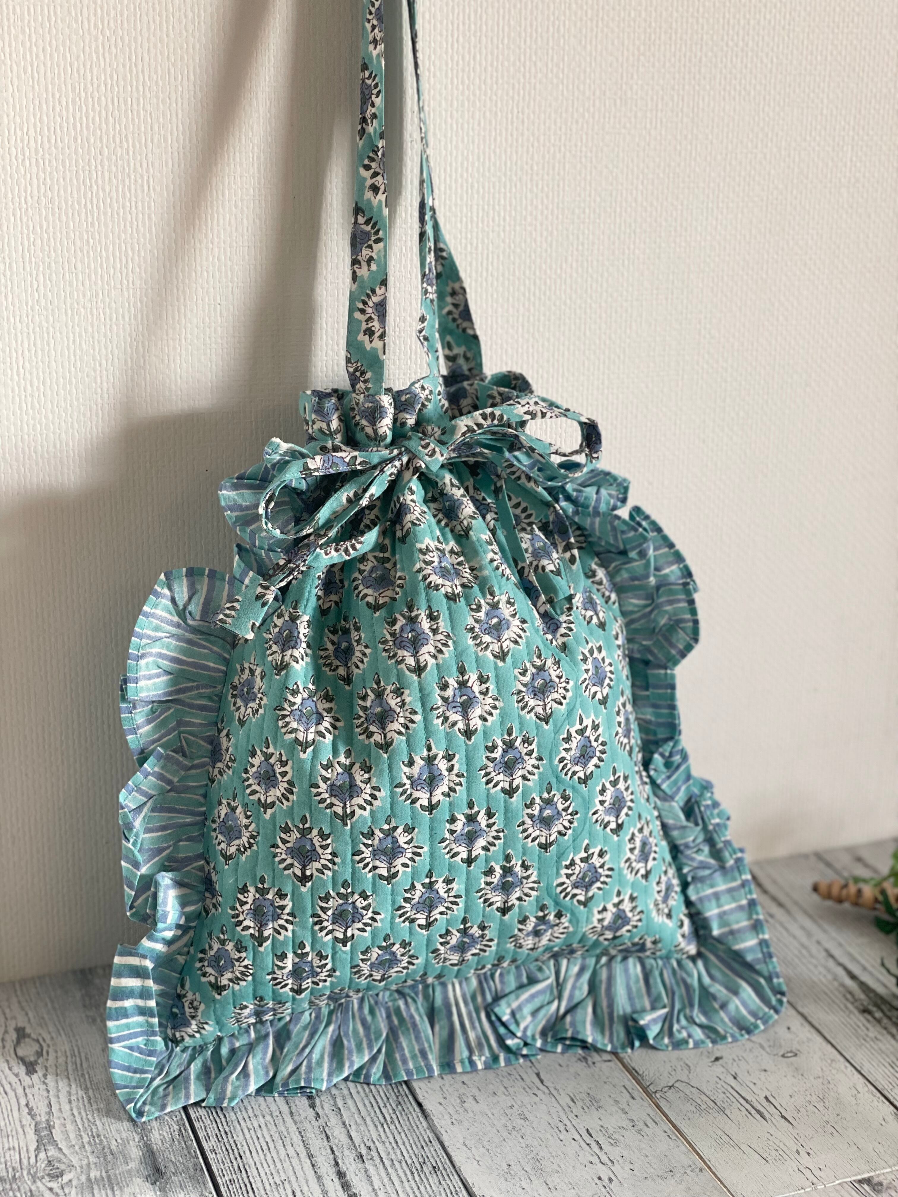 ブロックプリントのキルティング生地とフリルが可愛いトートバッグです。