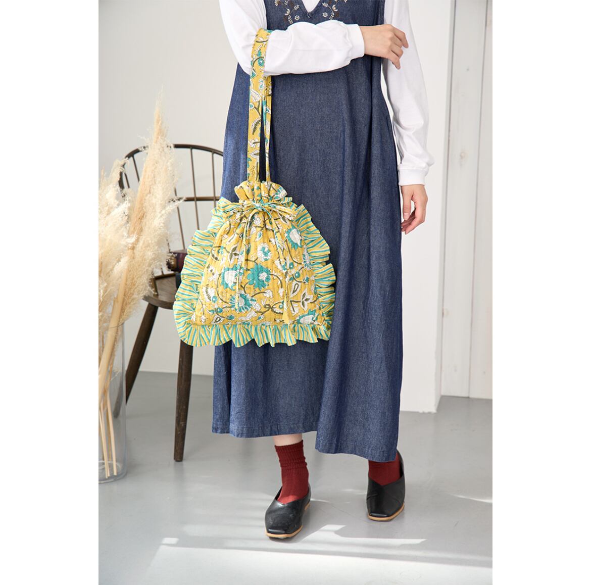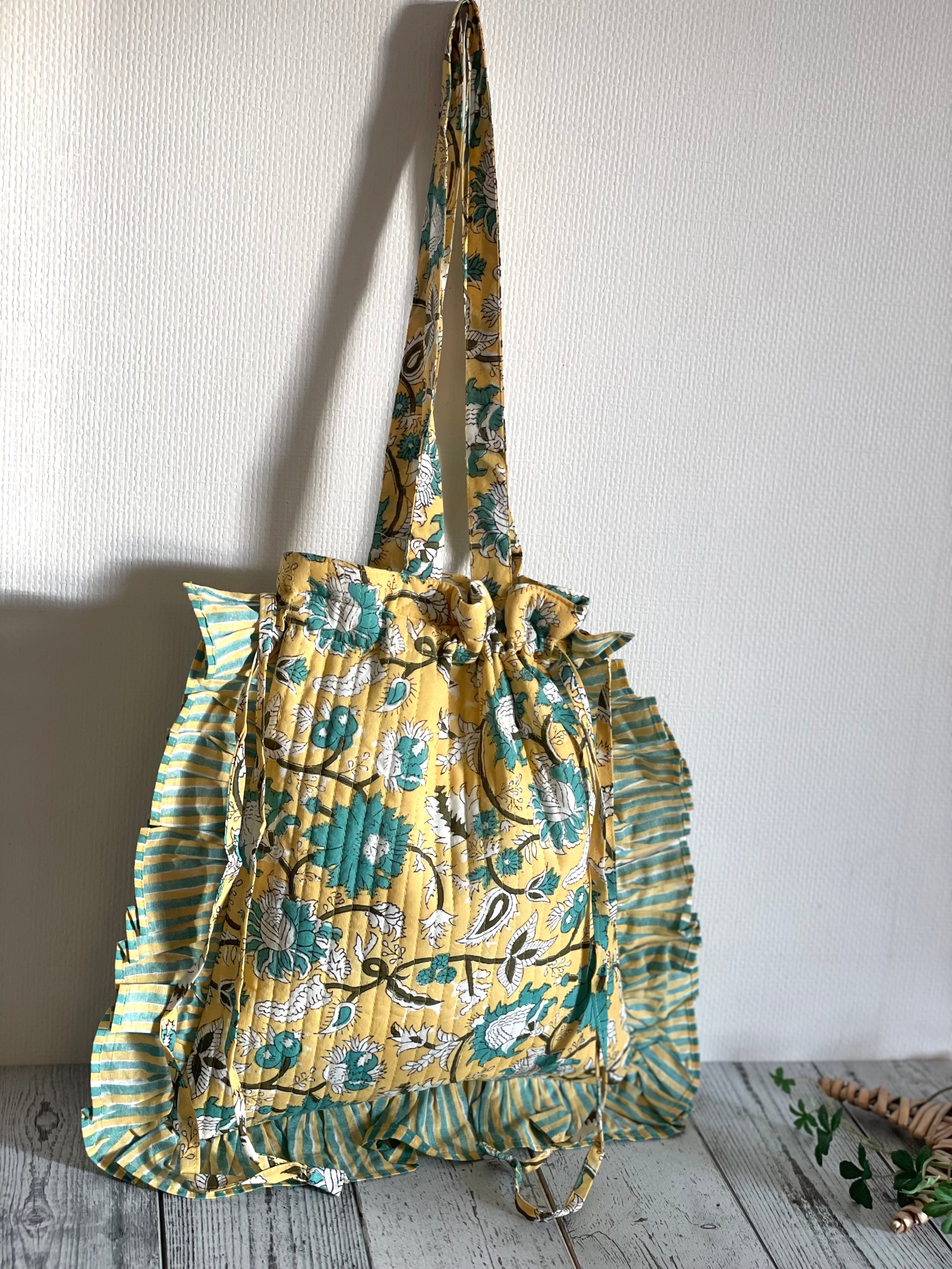 ブロックプリントのキルティング生地とフリルが可愛いトートバッグ。